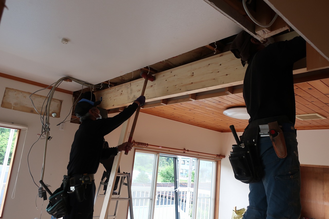 大きな梁を大工さん3人がかりで持ち上げ、少しずつ調整しながらしっかりと補強をおこないました。