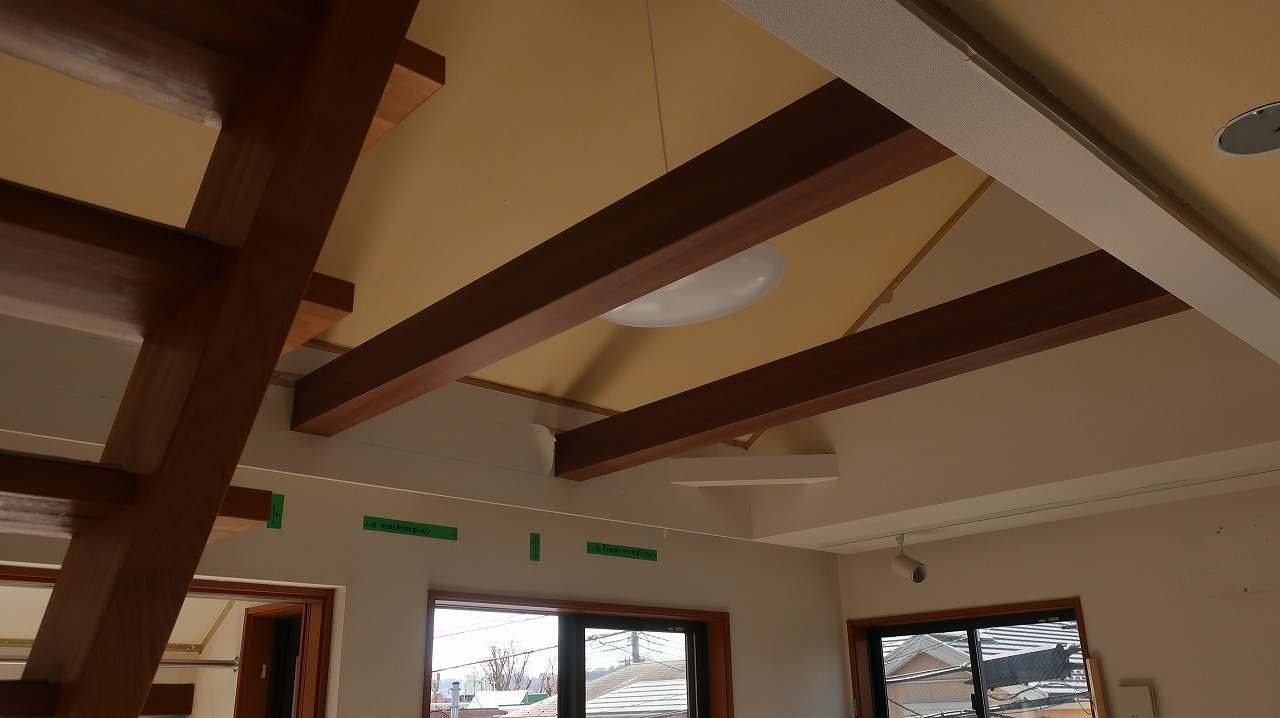 今回採用した南海プライウッドの『化粧梁』は中が空洞になっているため照明などの配線が可能です![]()