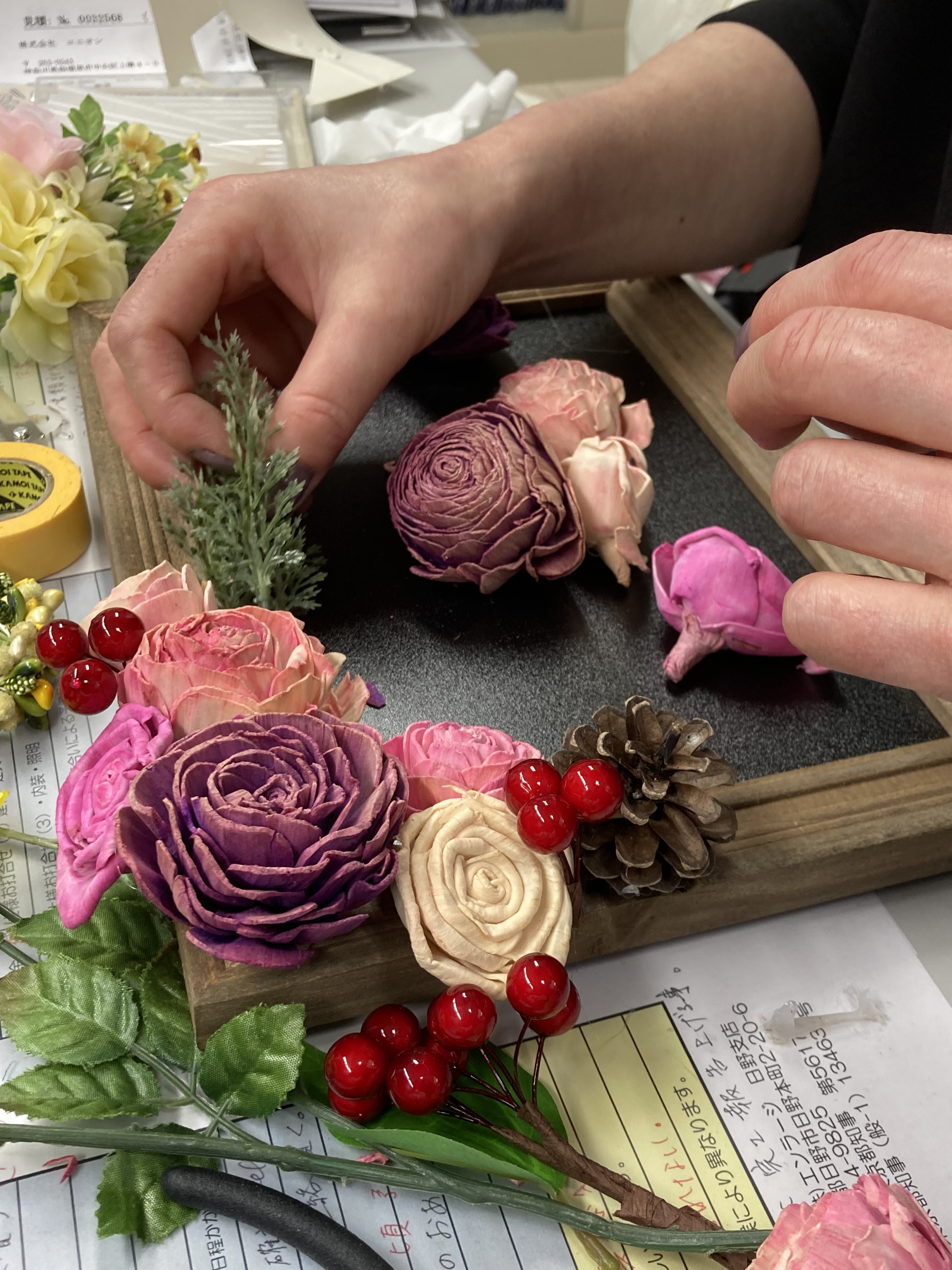 千春チーフが何やらたくさんのお花とグルーガンと格闘しながら何かを作成中…