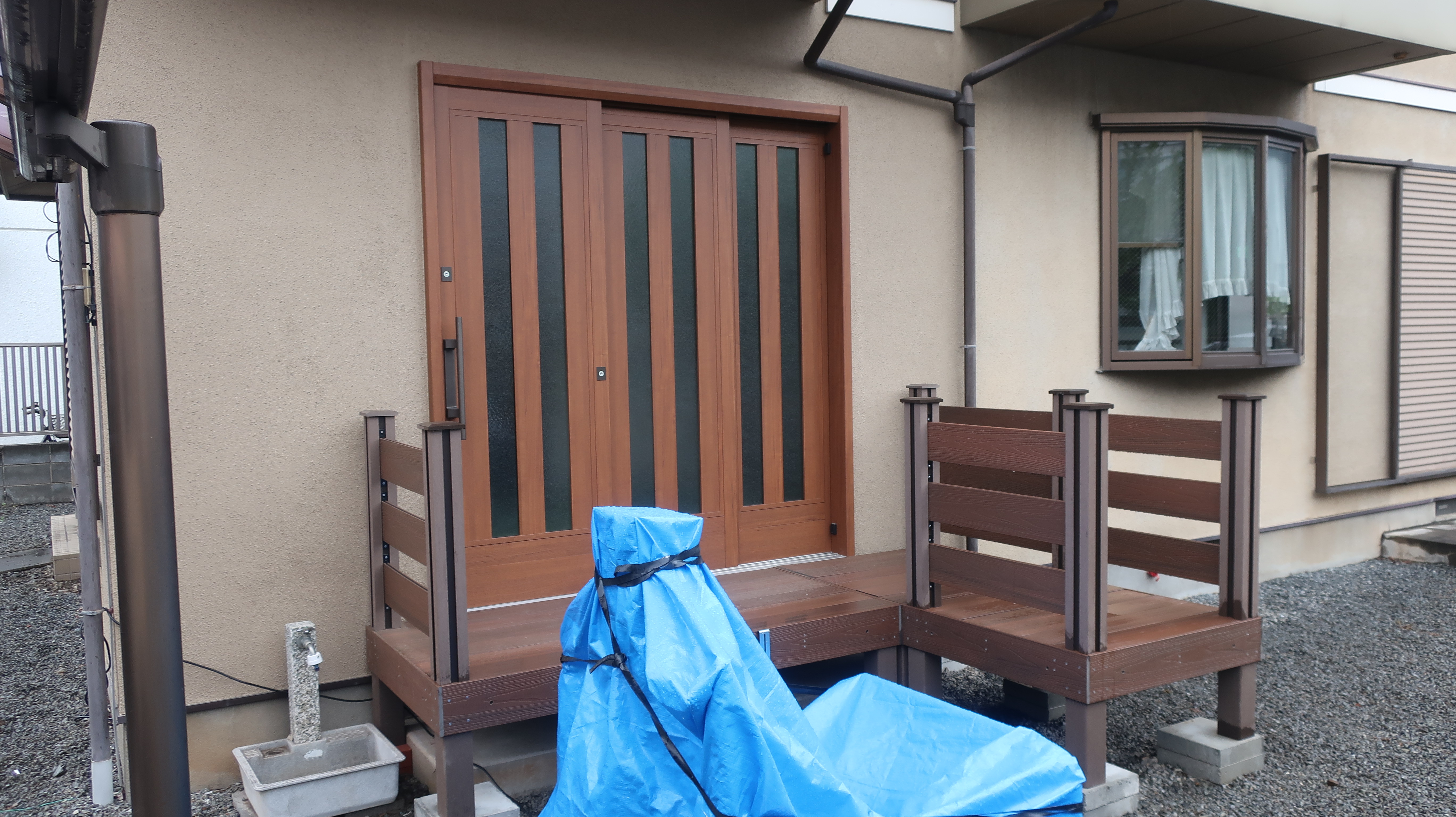 玄関ドアは、車いすで入りやすいよう2枚引き込み戸に交換いたしました