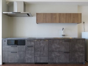 天板や扉の表情豊かなテクスチャーが絶妙な、無駄のない美しさのあるキッチンです。