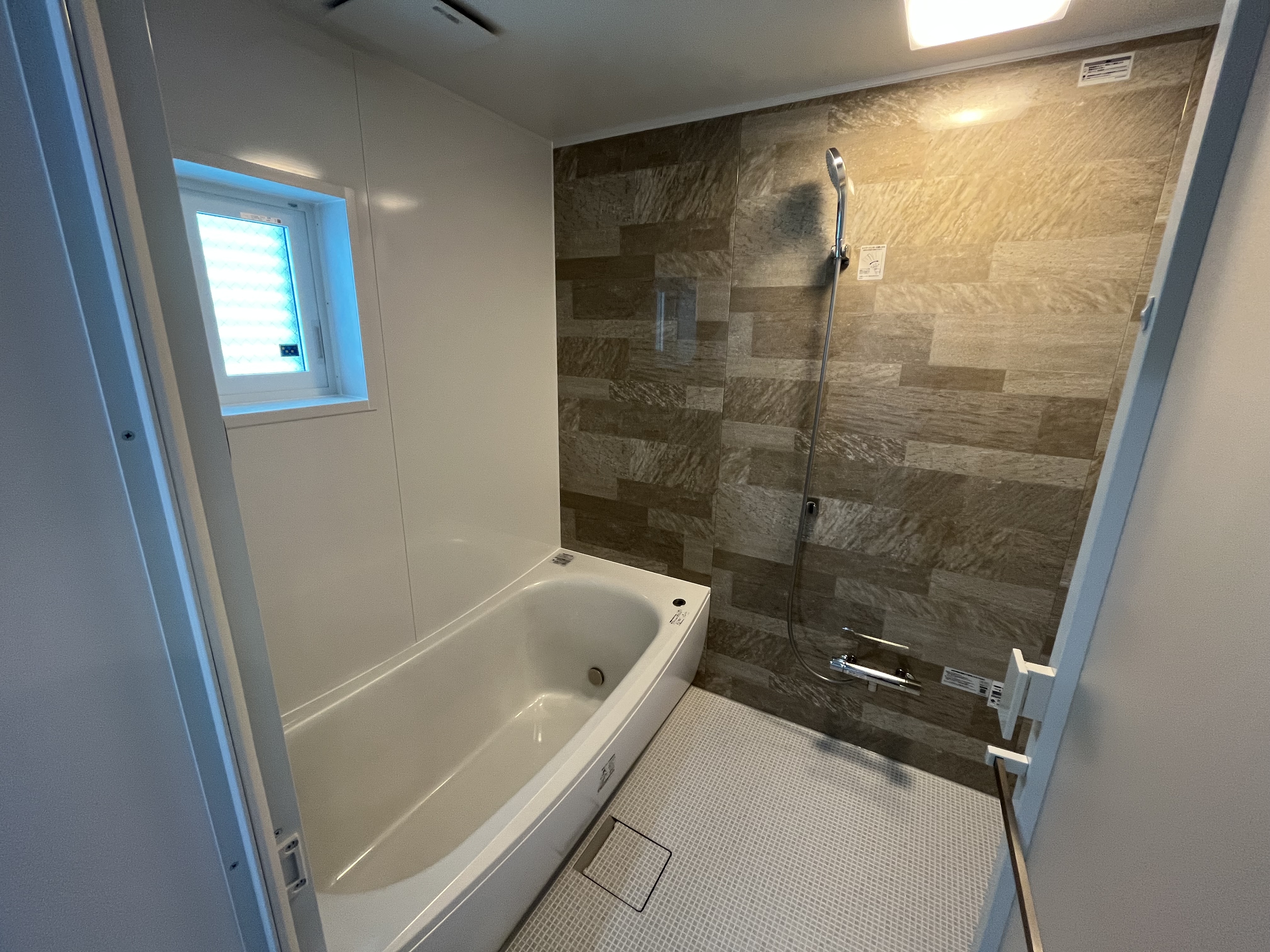 奥様こだわりで浴槽内の給湯器リモコンは出入口扉の近くに設置しました