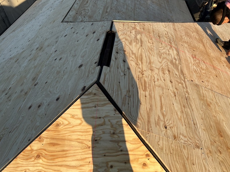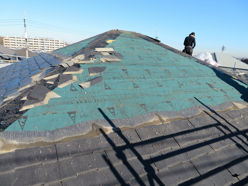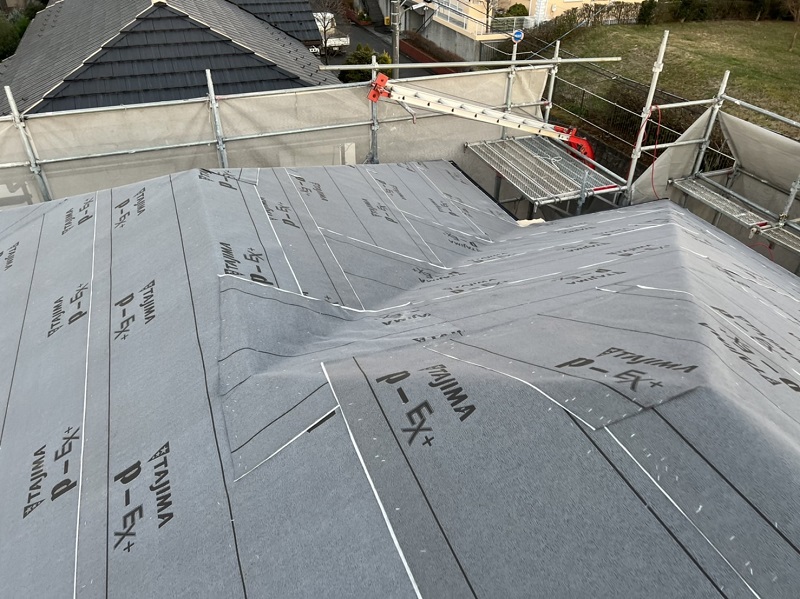 新しい屋根材を設置するための防水シート工事や下地工事をおこない…