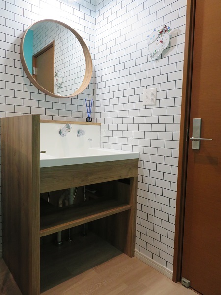 《事例③:まるでカフェ気分♪ タイルの配置にこだわった造作洗面》