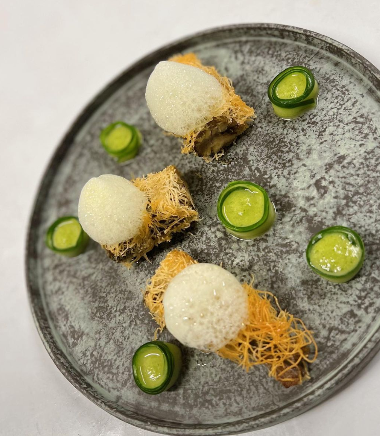 さらにカダイフ(天使の髪とも言われる麺の一種)を巻いて焼き上げました![]()