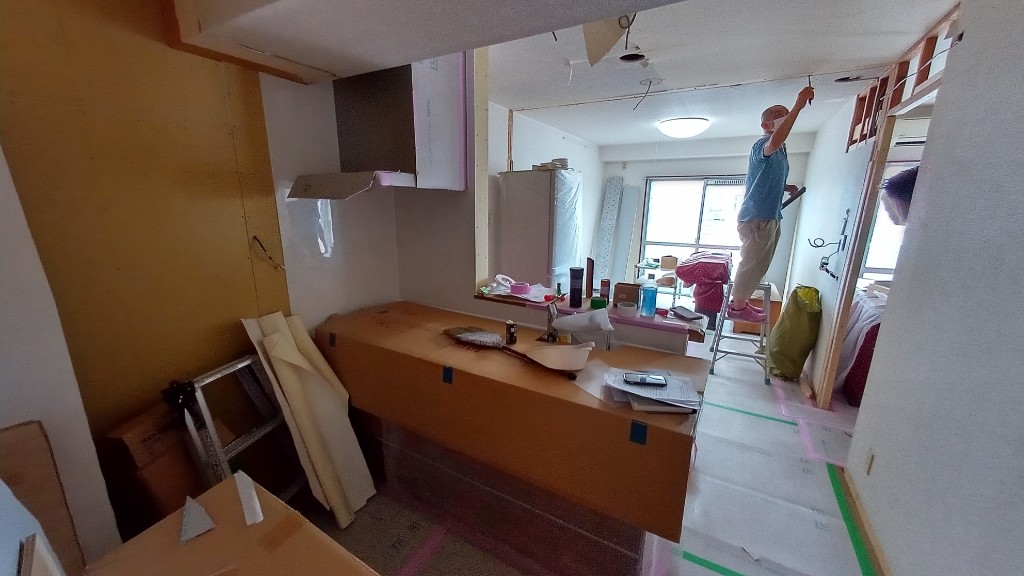 キッチンも無事に取り付けができ、傷がつかないように養生をしています