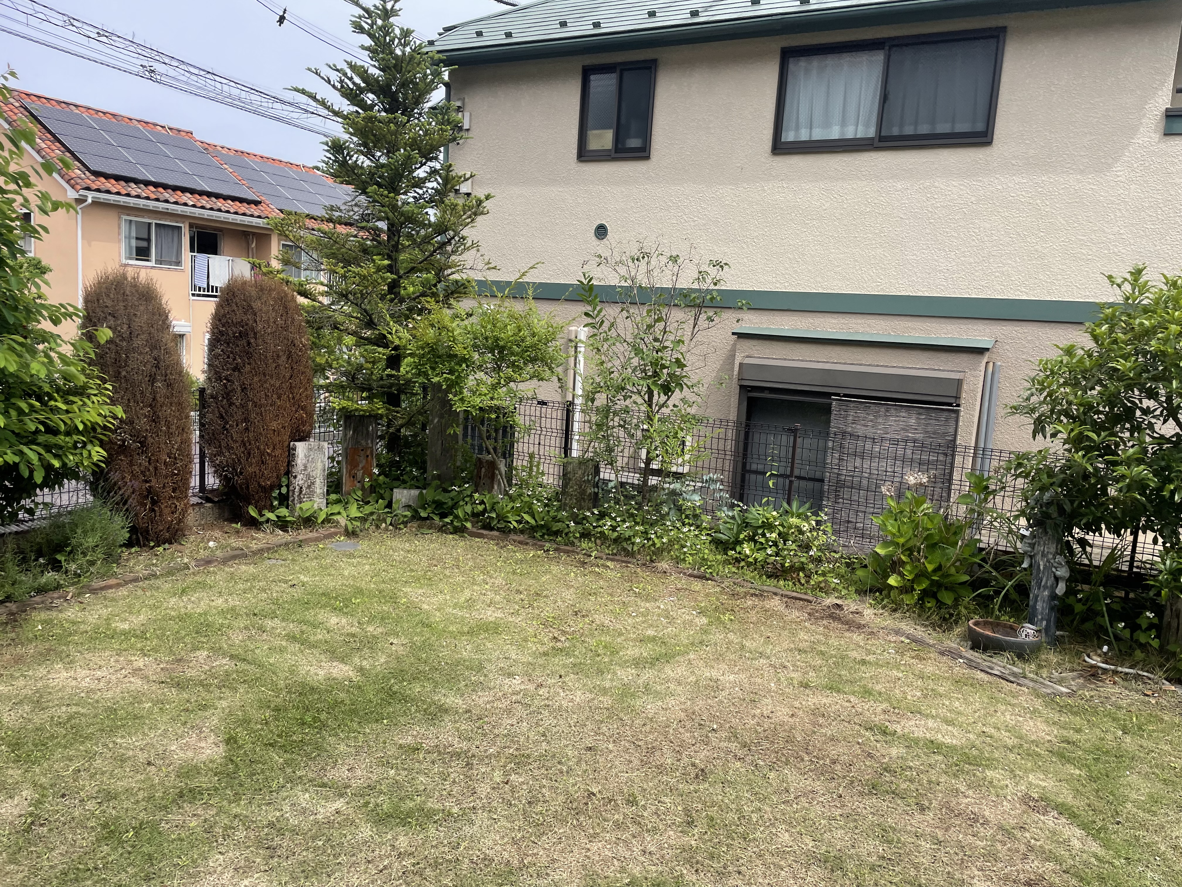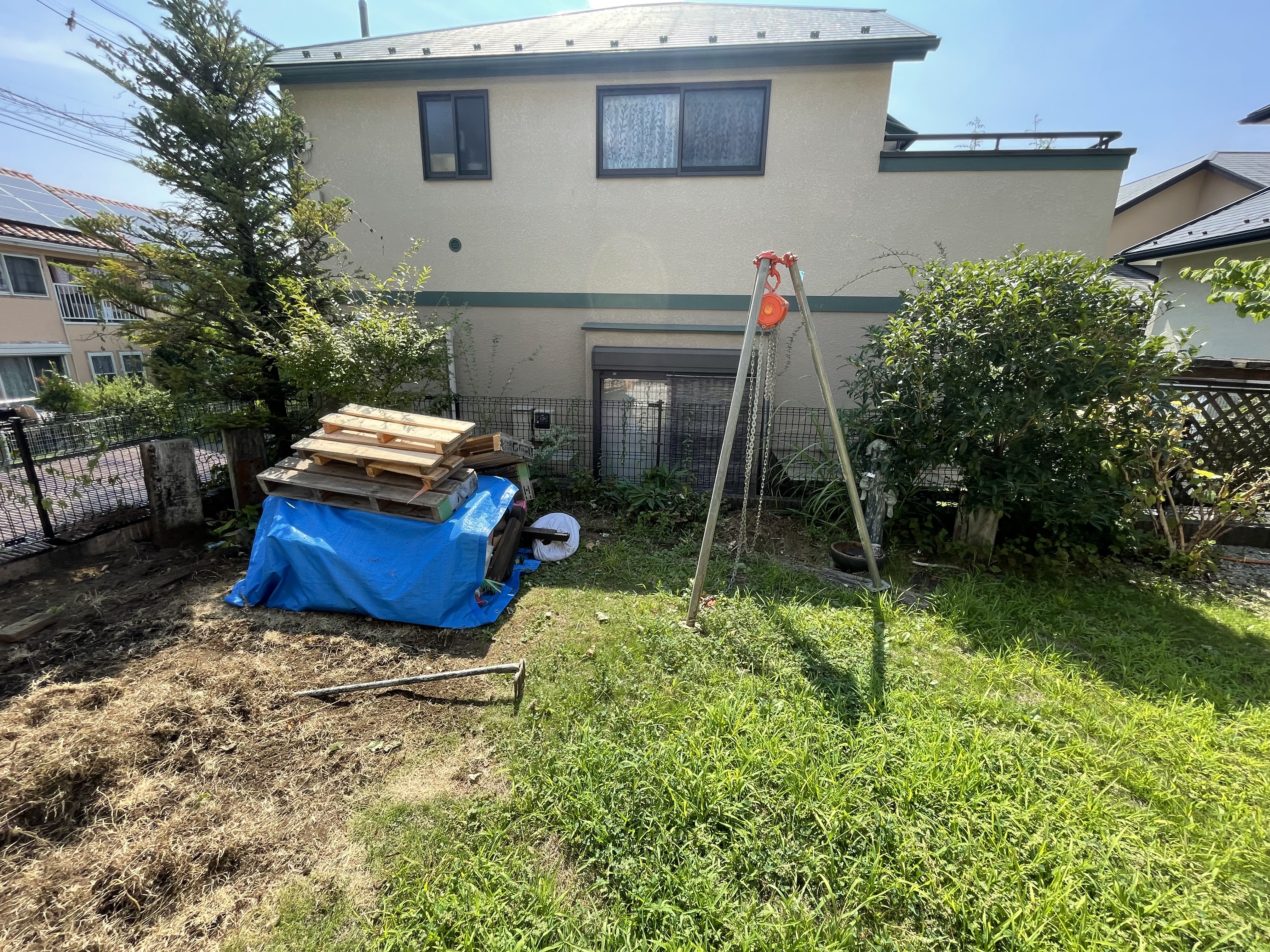 こちらの広いお庭は不要な植栽を伐採・抜根して、お子様が遊べる「砂場」を作っていきます。