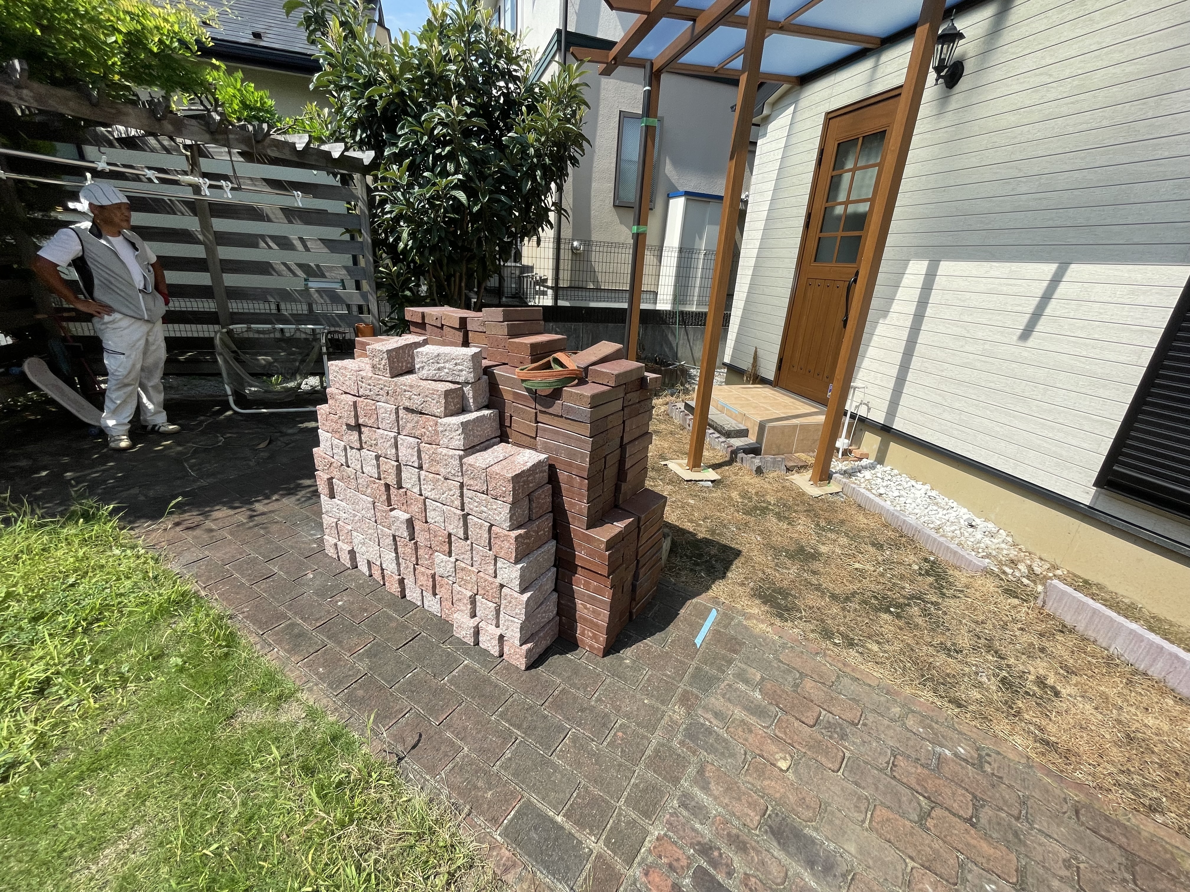 たくさんのレンガやインターロッキングを見ながら完成をイメージしているのは