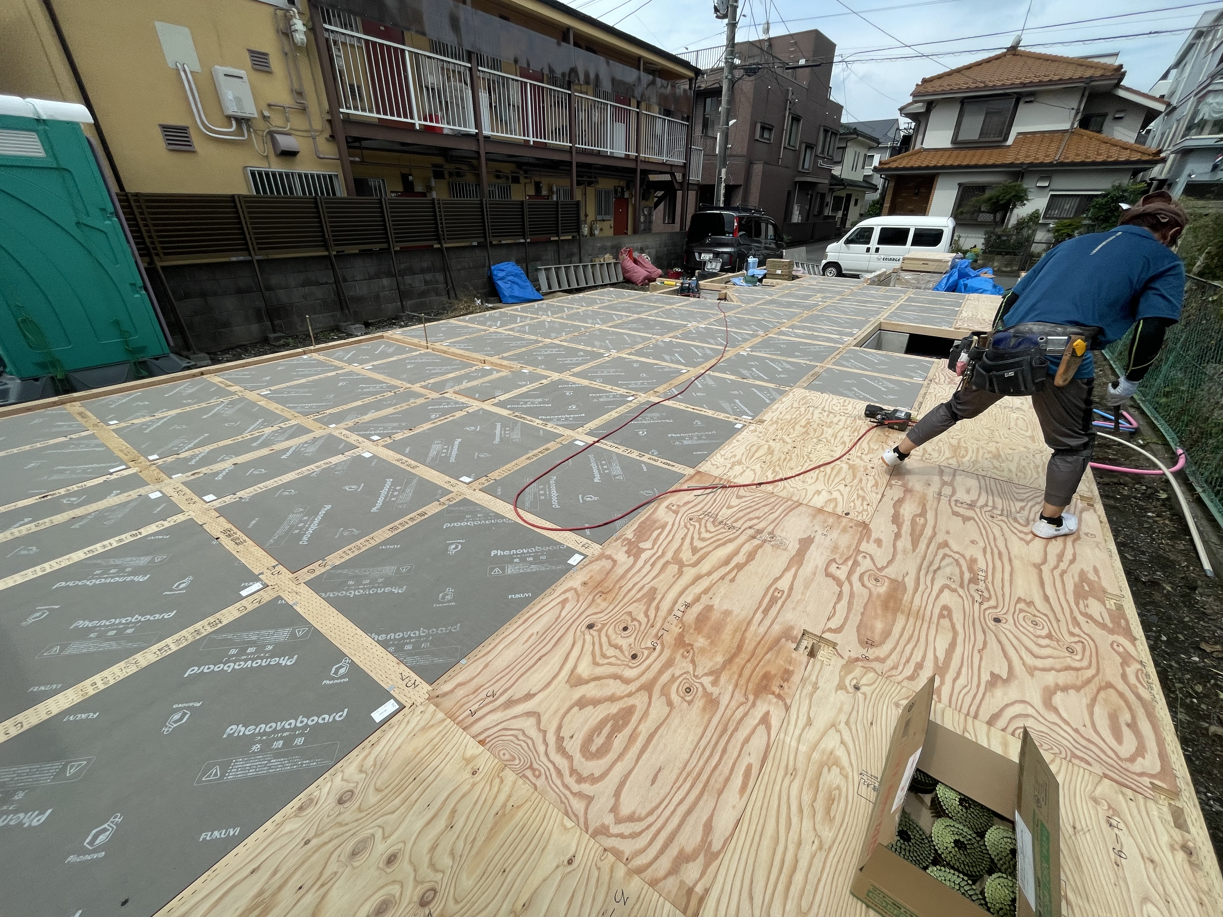 根太レス工法なので、24mm厚の構造用合板を貼りました。