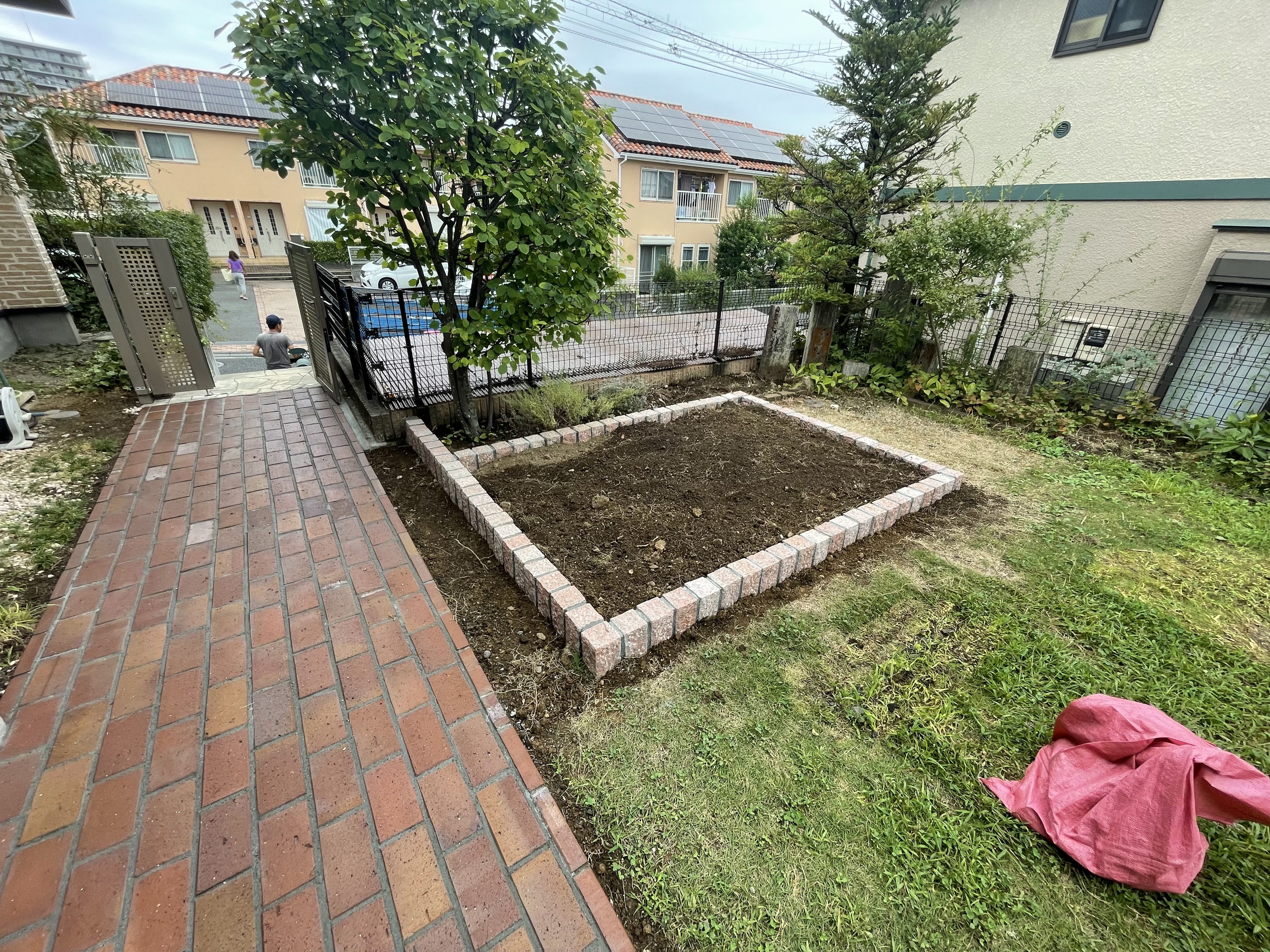 お子様用の砂場を計画していた場所は途中で変更があり、家庭菜園になりました。