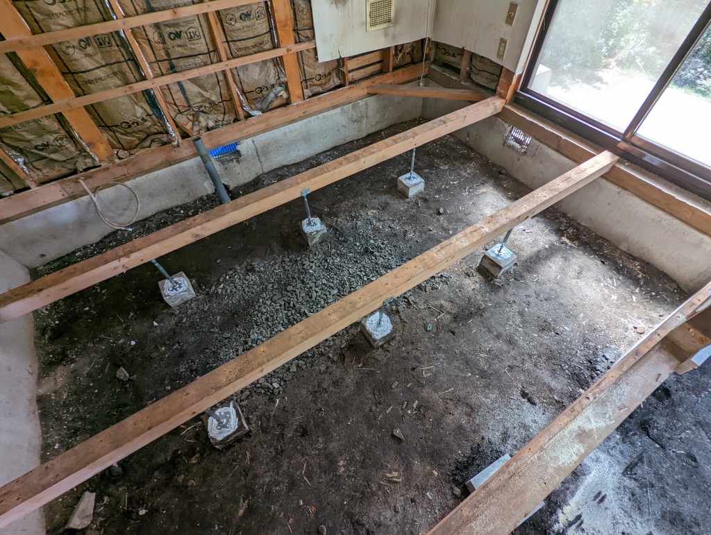 床を支える束を鋼製束に交換し、レベルを測りながら水平にしていきます。