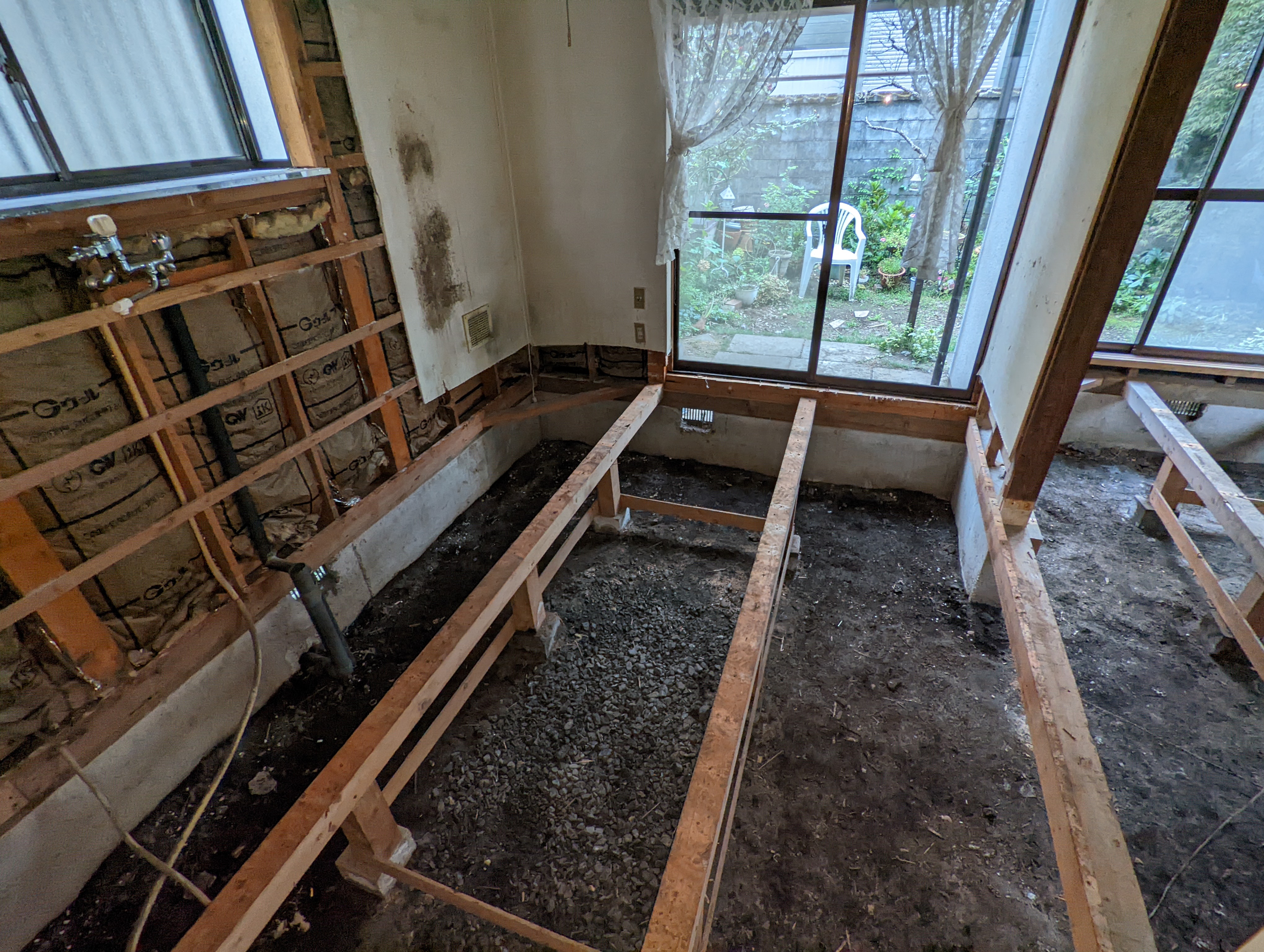 床は少し傾いていたので全部解体して、大引きや根太からやり替えていきます。