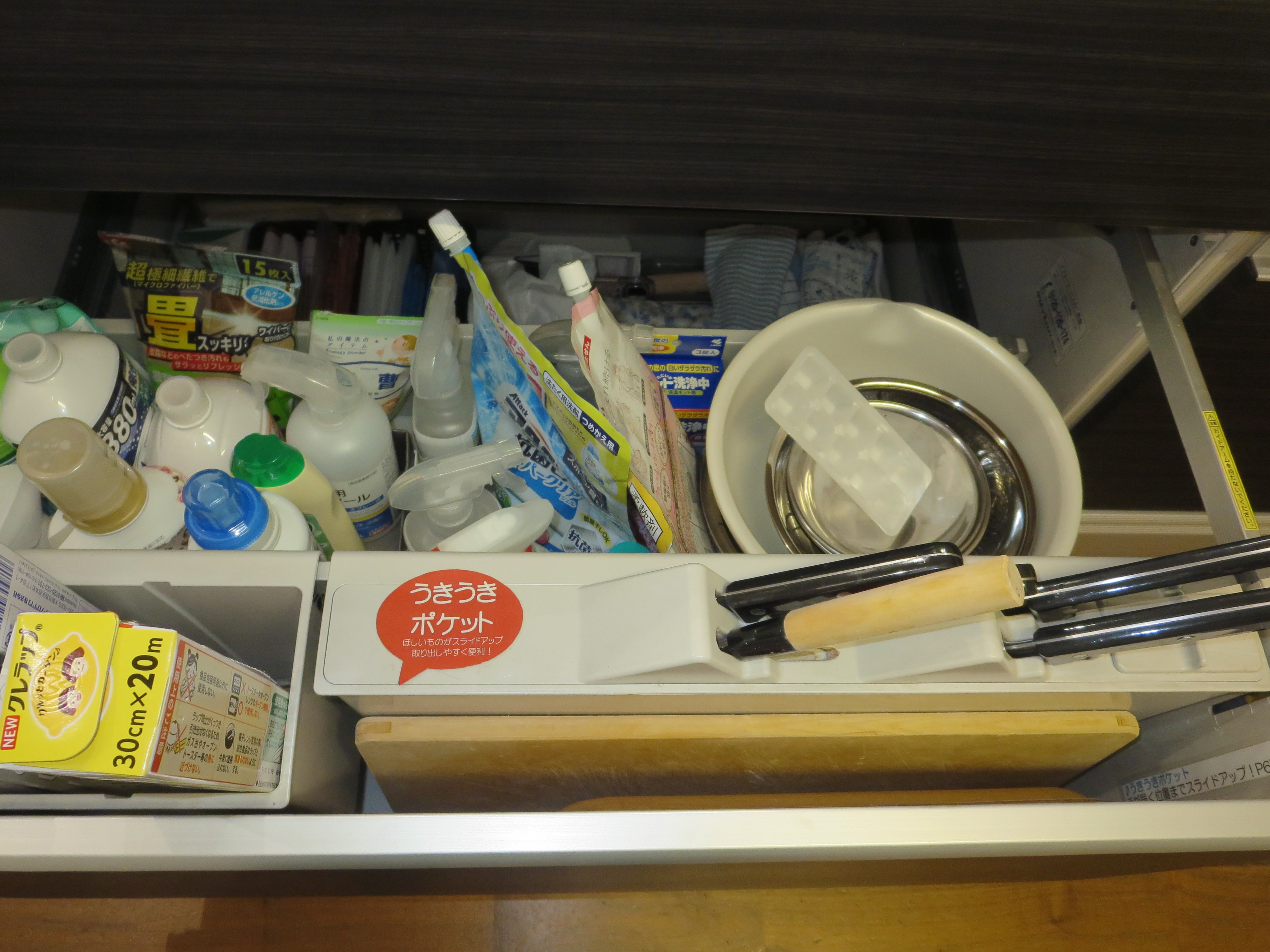 シンク下の引き出しにはたくさんの包丁やまな板が収納されています![]()