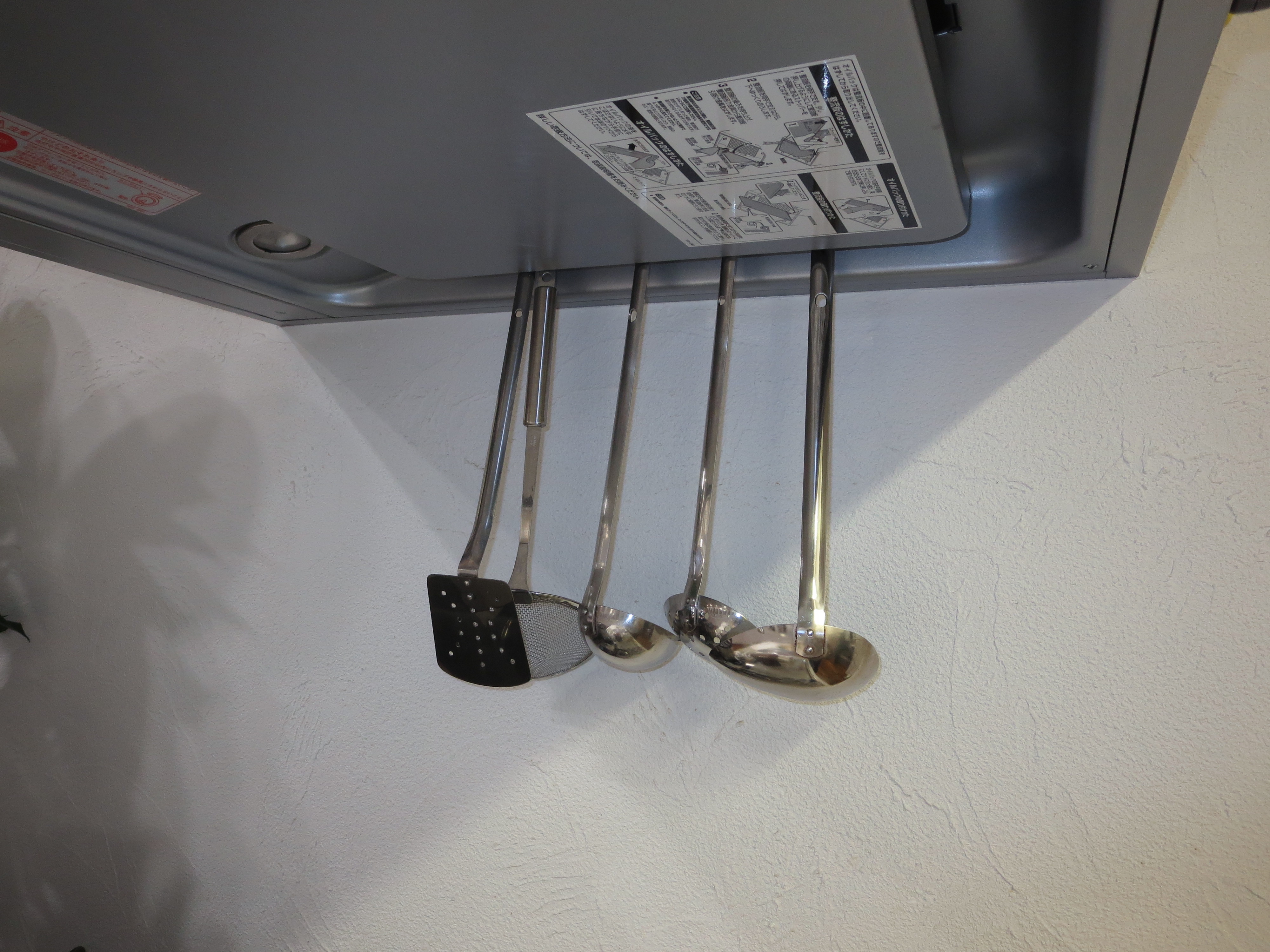 キッチンのレンジフードのフチには、レストランの厨房のようにレードル等がぶら下がっています