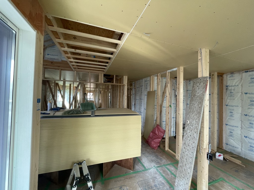 内部も大工さんの工事が順調に進み、内装下地のボード貼りを始めたところです。