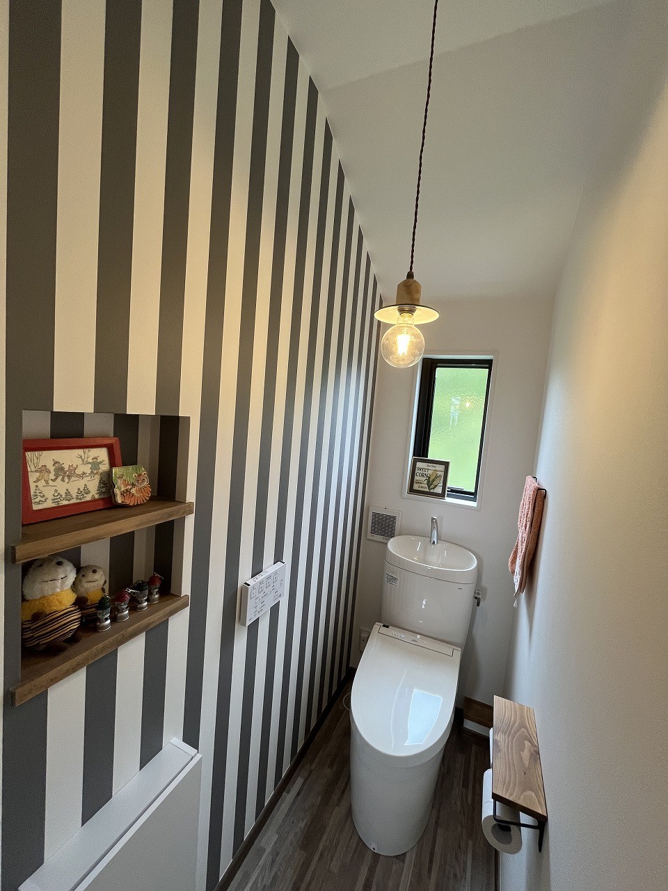 トイレの中は1階とおそろいのストライプのクロスが印象的です。