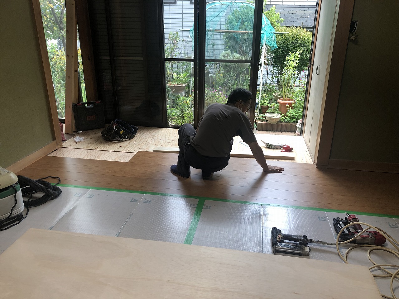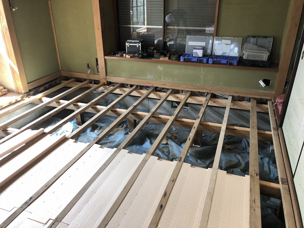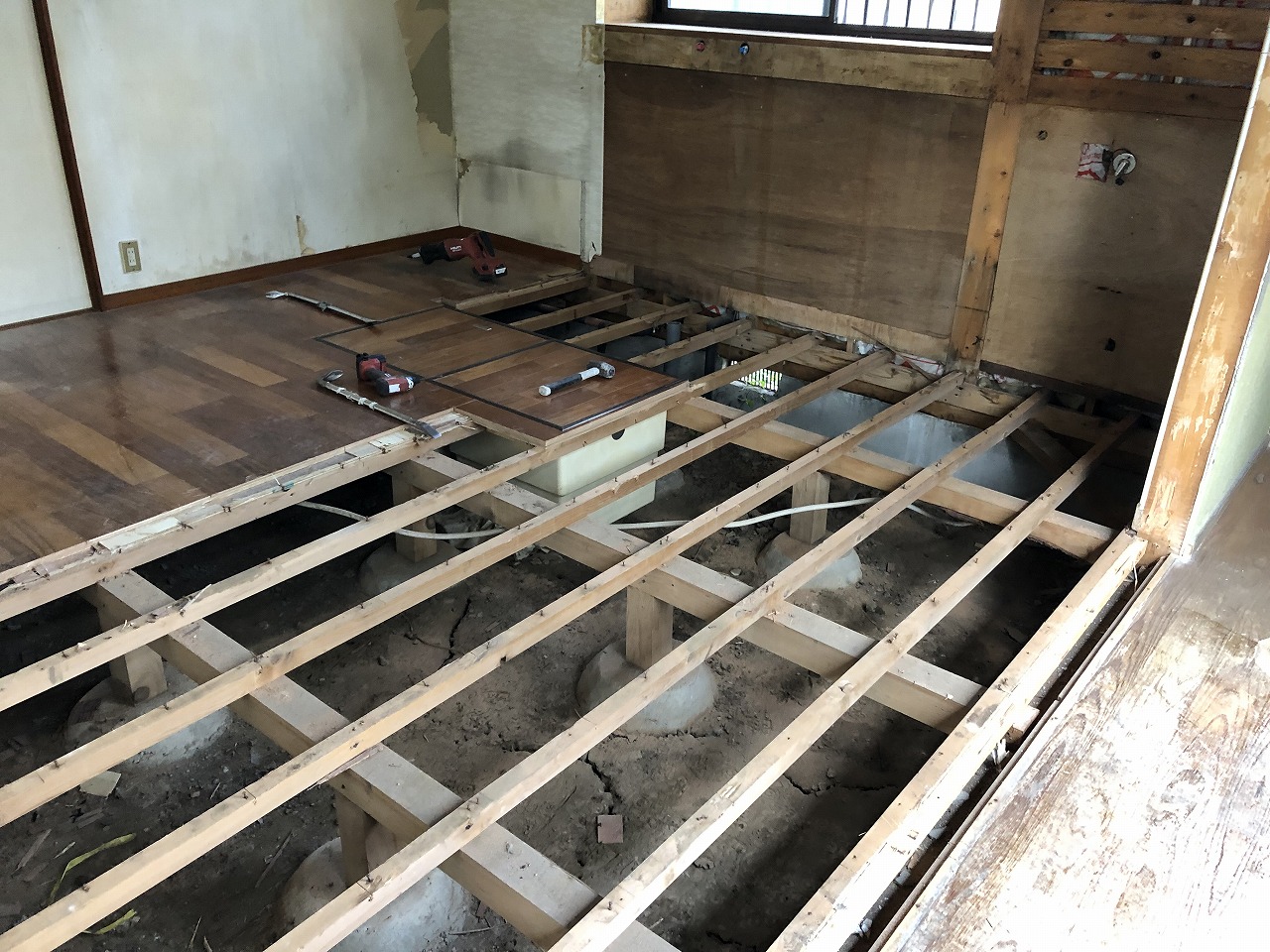 まずは各部屋の床を解体し、断熱材を入れたり床の段差を解消して仕上げのフローリングを貼っていきます。
