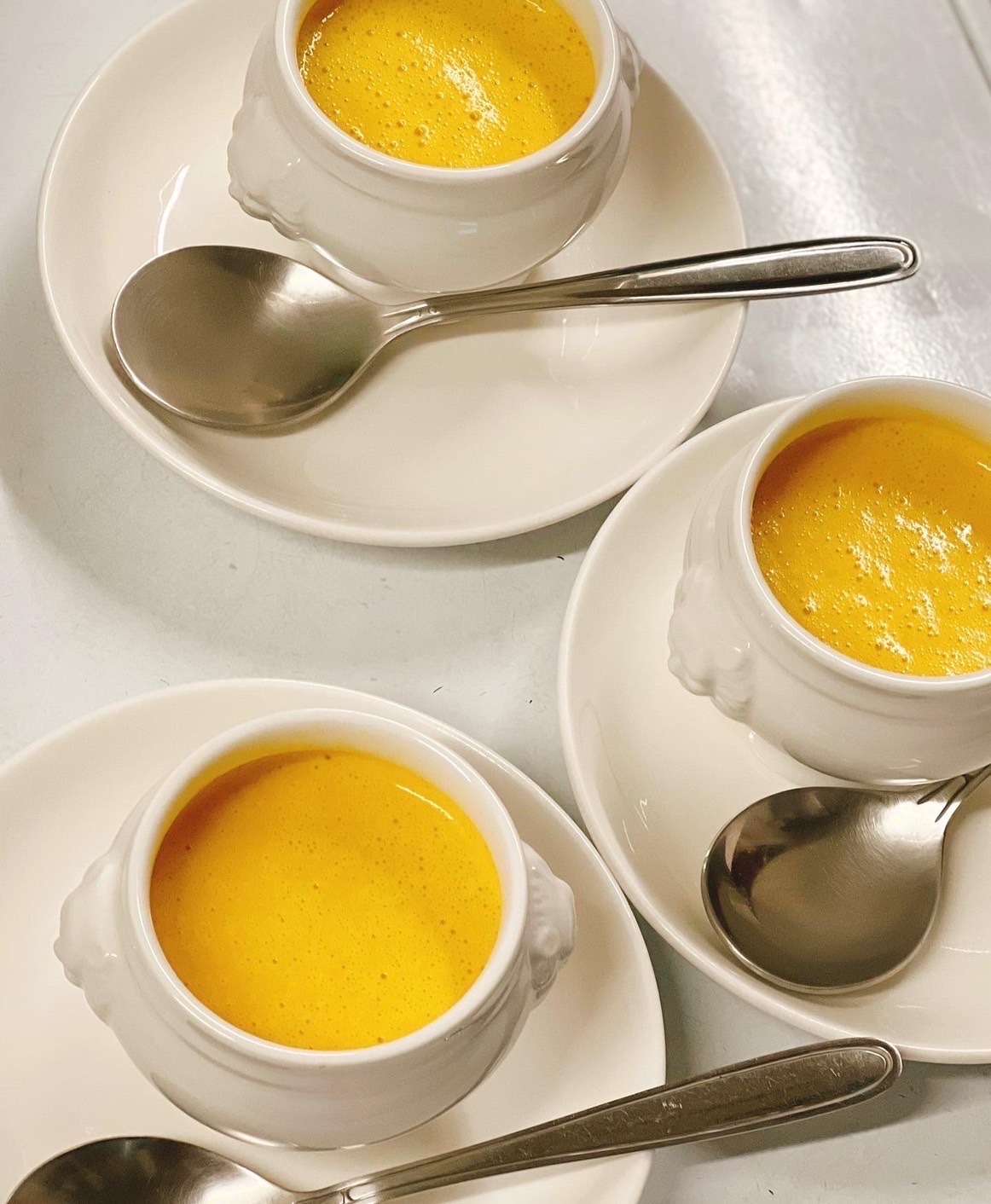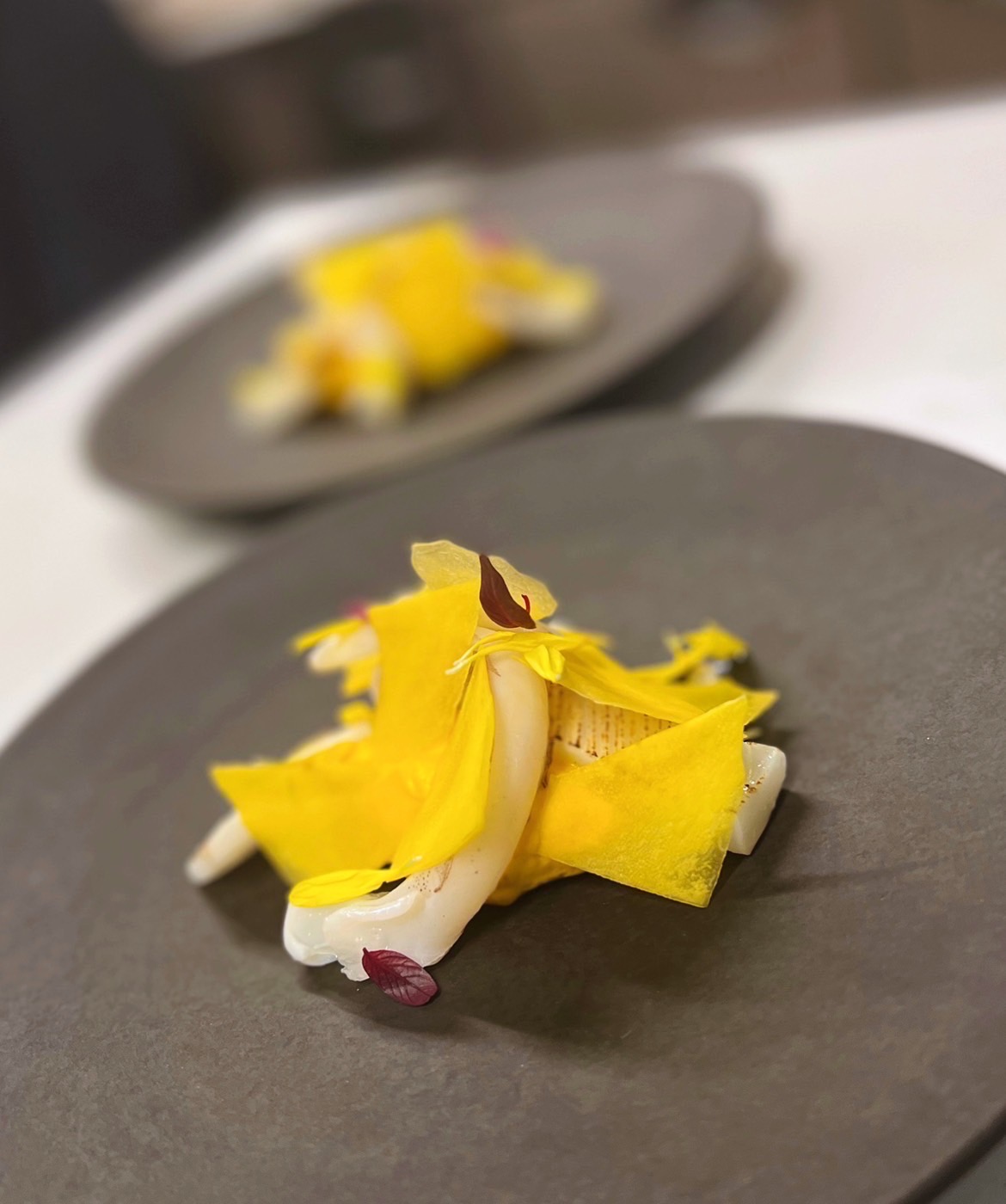 カボチャのムースの上に火で炙ったケンサキイカと、