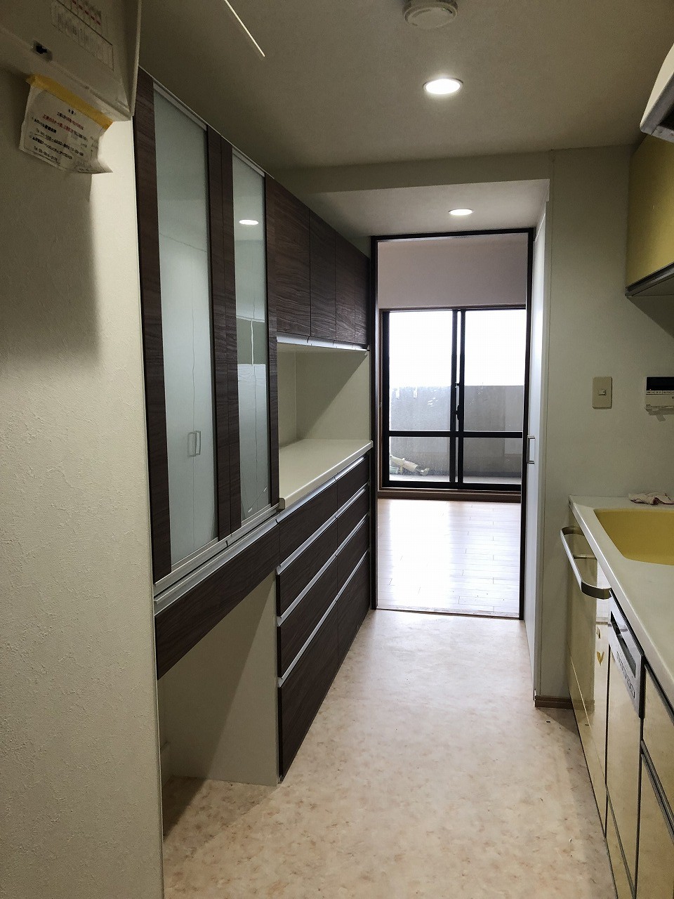 T様の悩みの一つでもあったキッチンの収納の少なさを解消するため、右写真の正面に写っている梁型の際まで仕切り壁を移動しました。