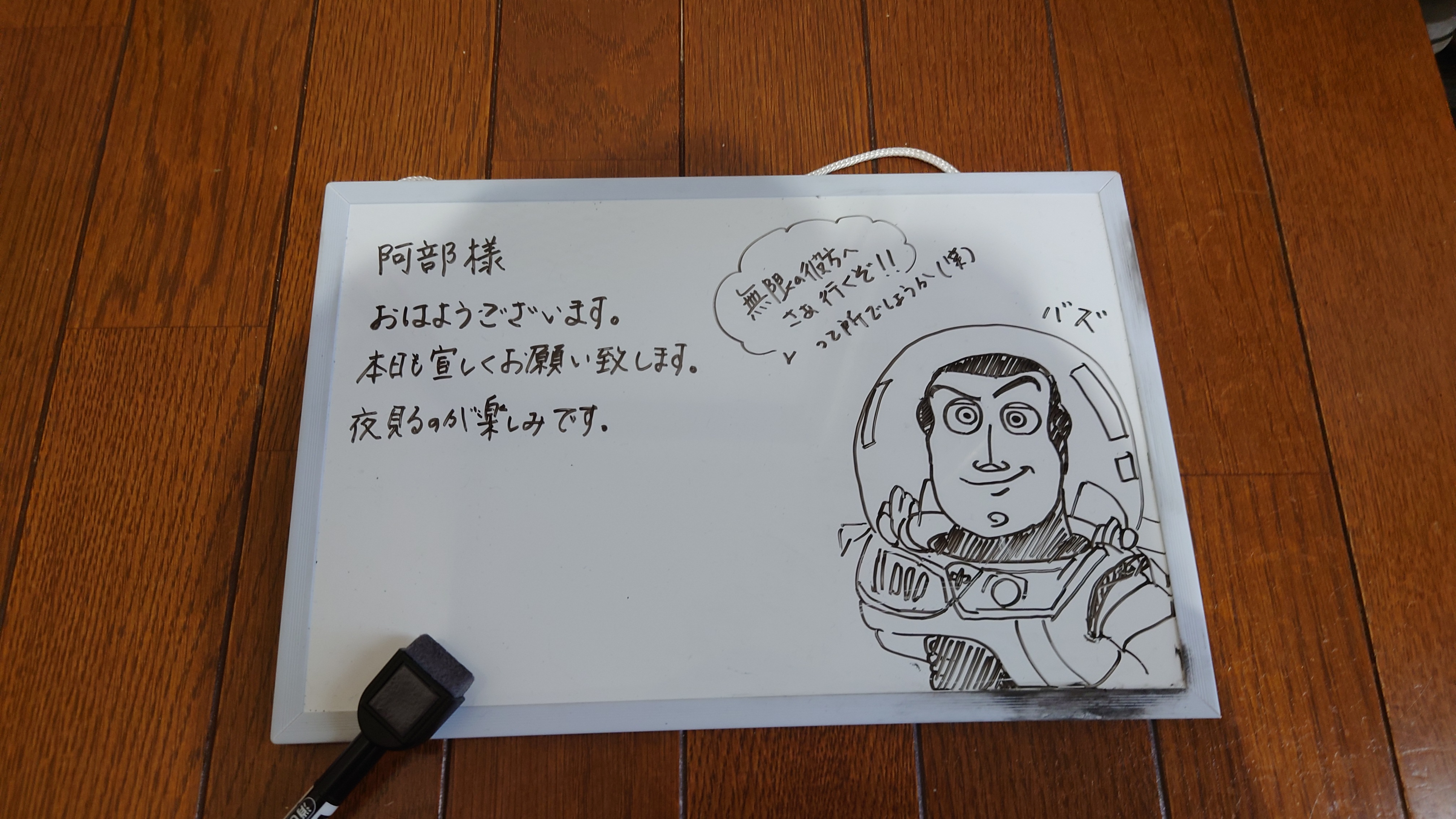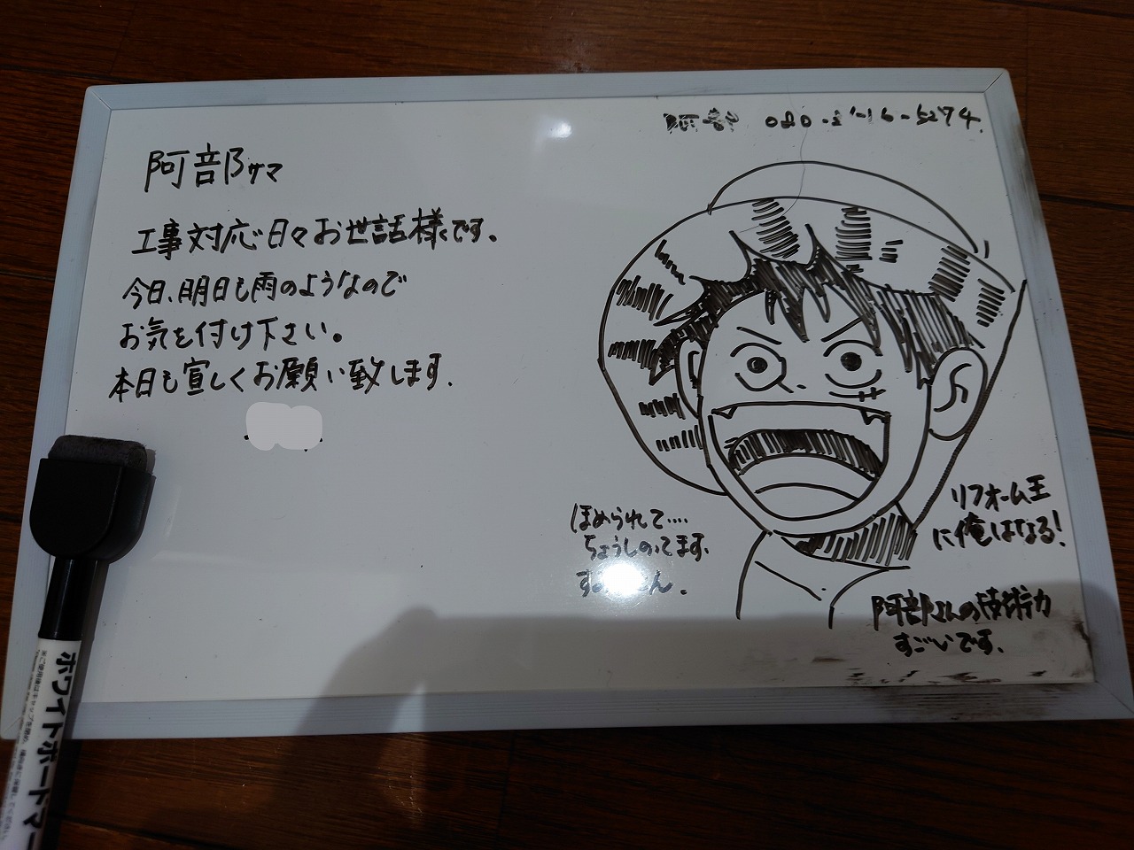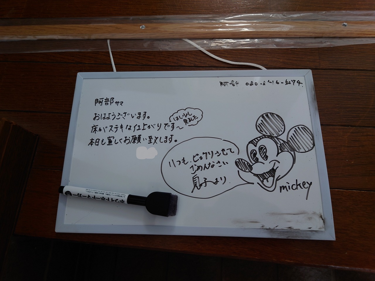 そして工事中にお会いできなかったのでホワイトボードでメッセージを残しておいたら、