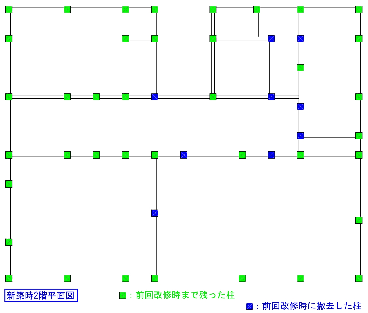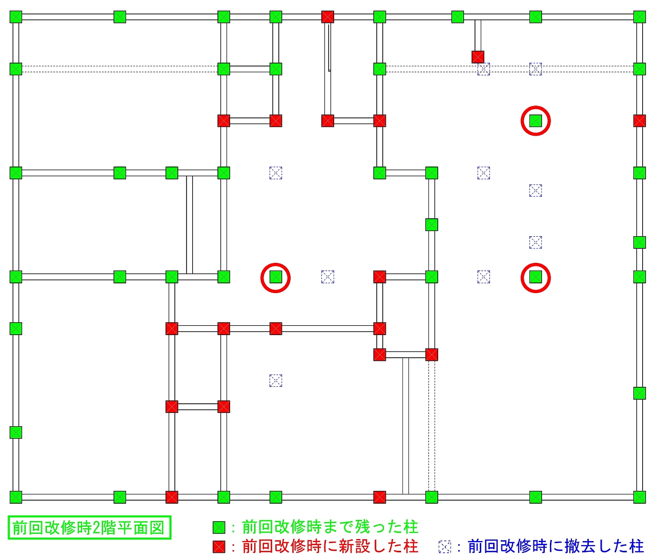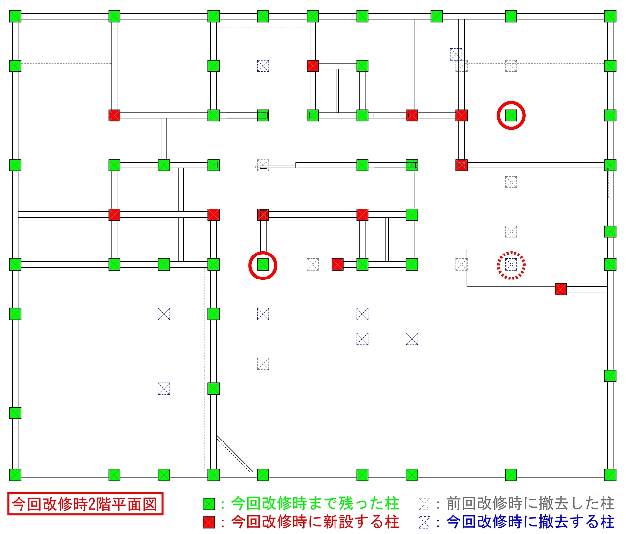 前回改修時には、「青い破線の柱」を撤去し、「赤い柱」を新設しています。