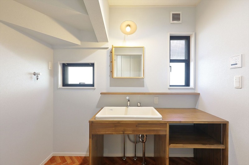 ↑ お客様のお好みと使い勝手を追求した造作洗面台