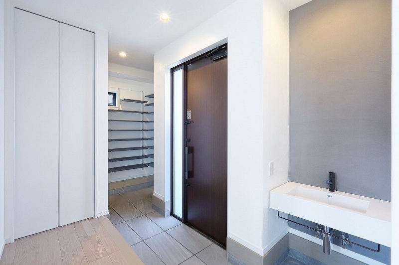 ↑ 帰宅後すぐに手が洗える玄関横の造作洗面台