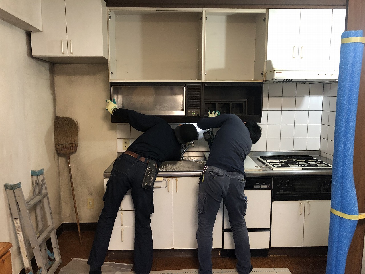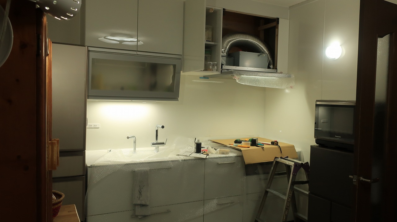 向かって右側のレンジフードの排気口がコンクリートの壁に直接埋め込まれていて角型の特殊な形状だったため、