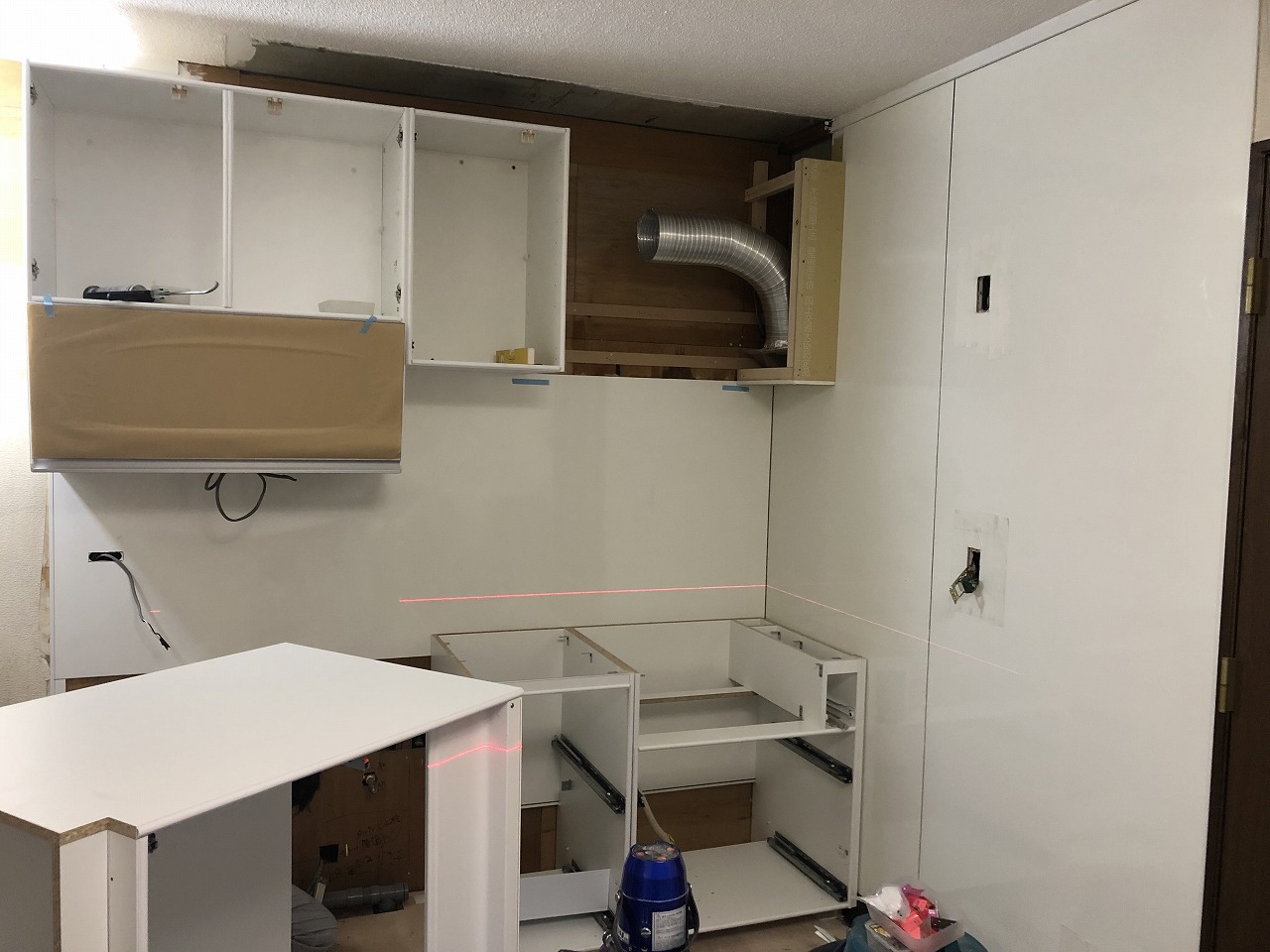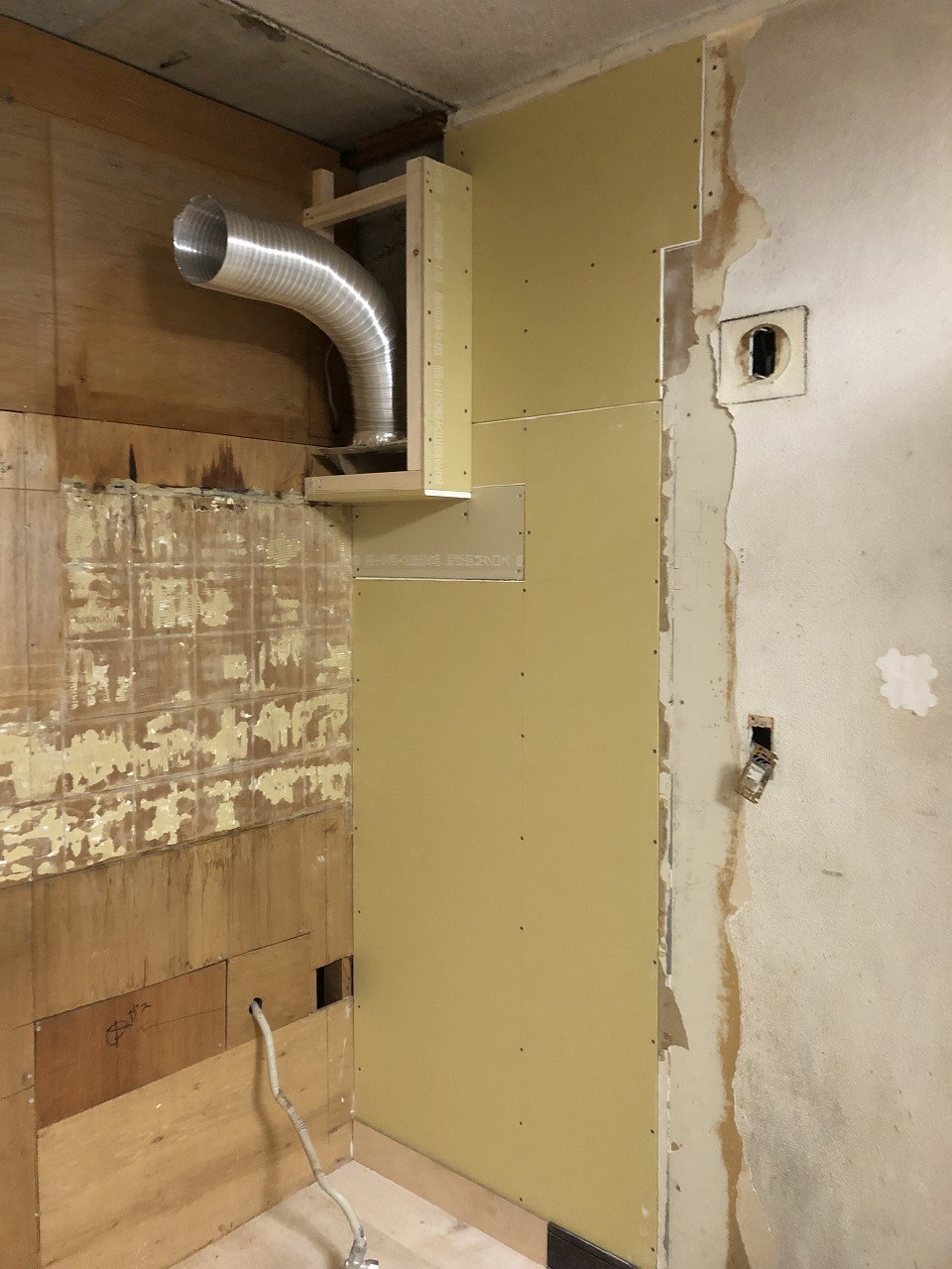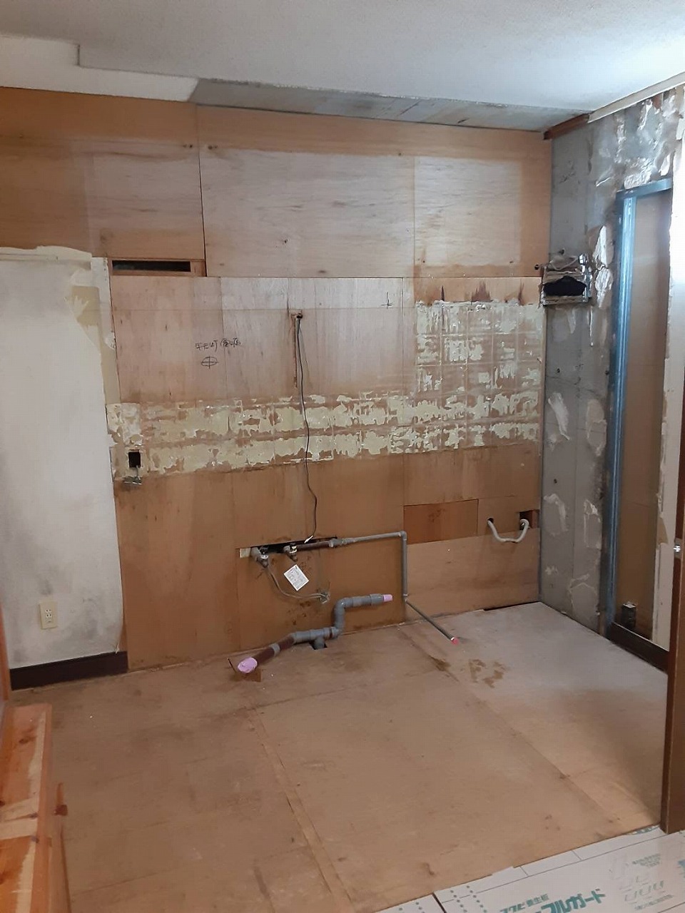 排気ダクトの部分は大工さんに壁を作ってもらい、キッチンパネルで仕上げることになりました