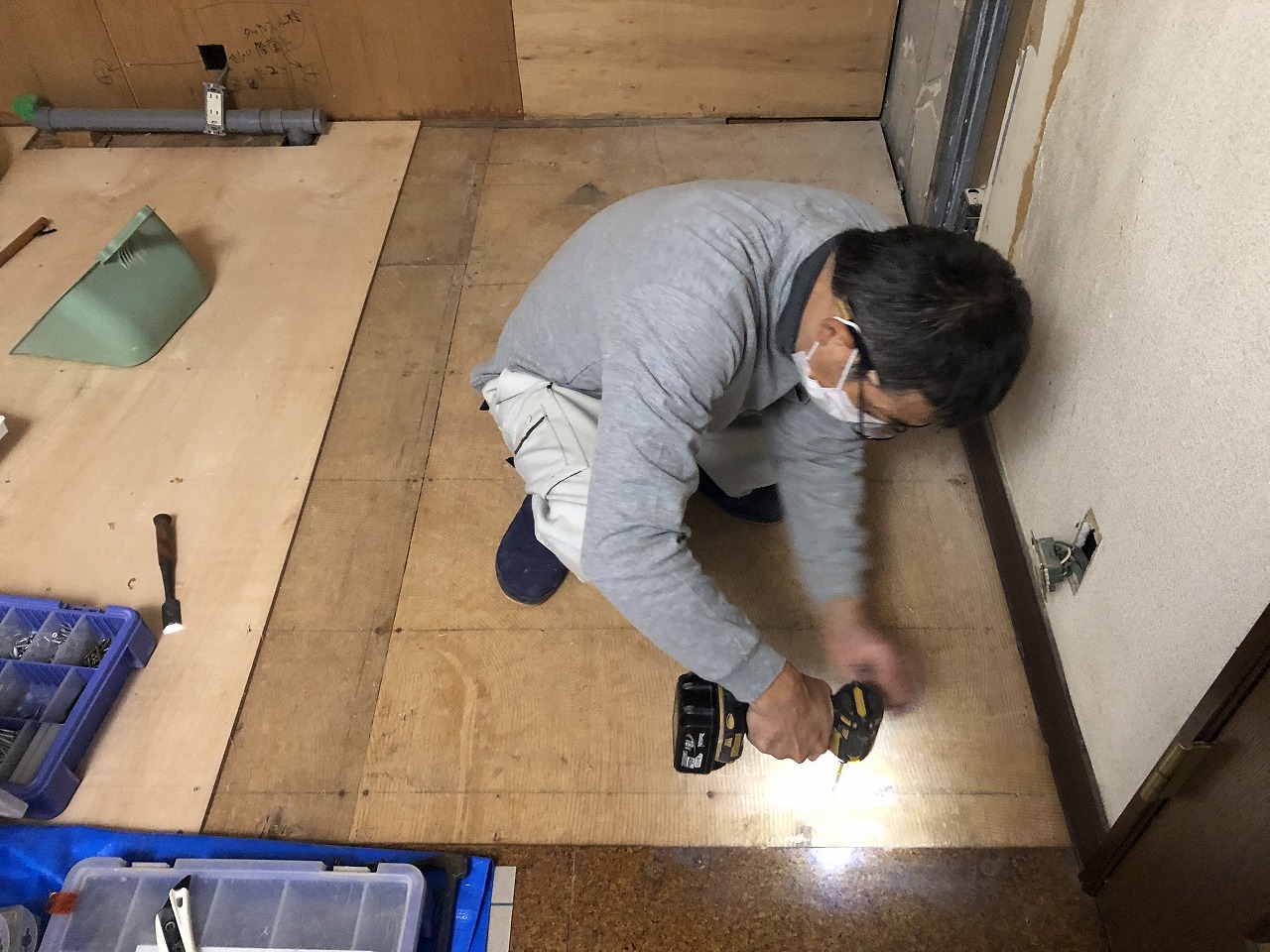 丁寧に床の下地を作っていただき、仕上げはコルクタイルを貼っていきます