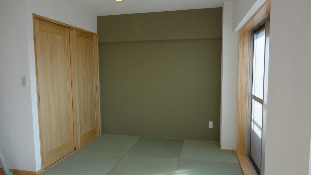 壁は北海道産の珪藻土塗り、床はヘリなしの半畳たたみ敷きに
