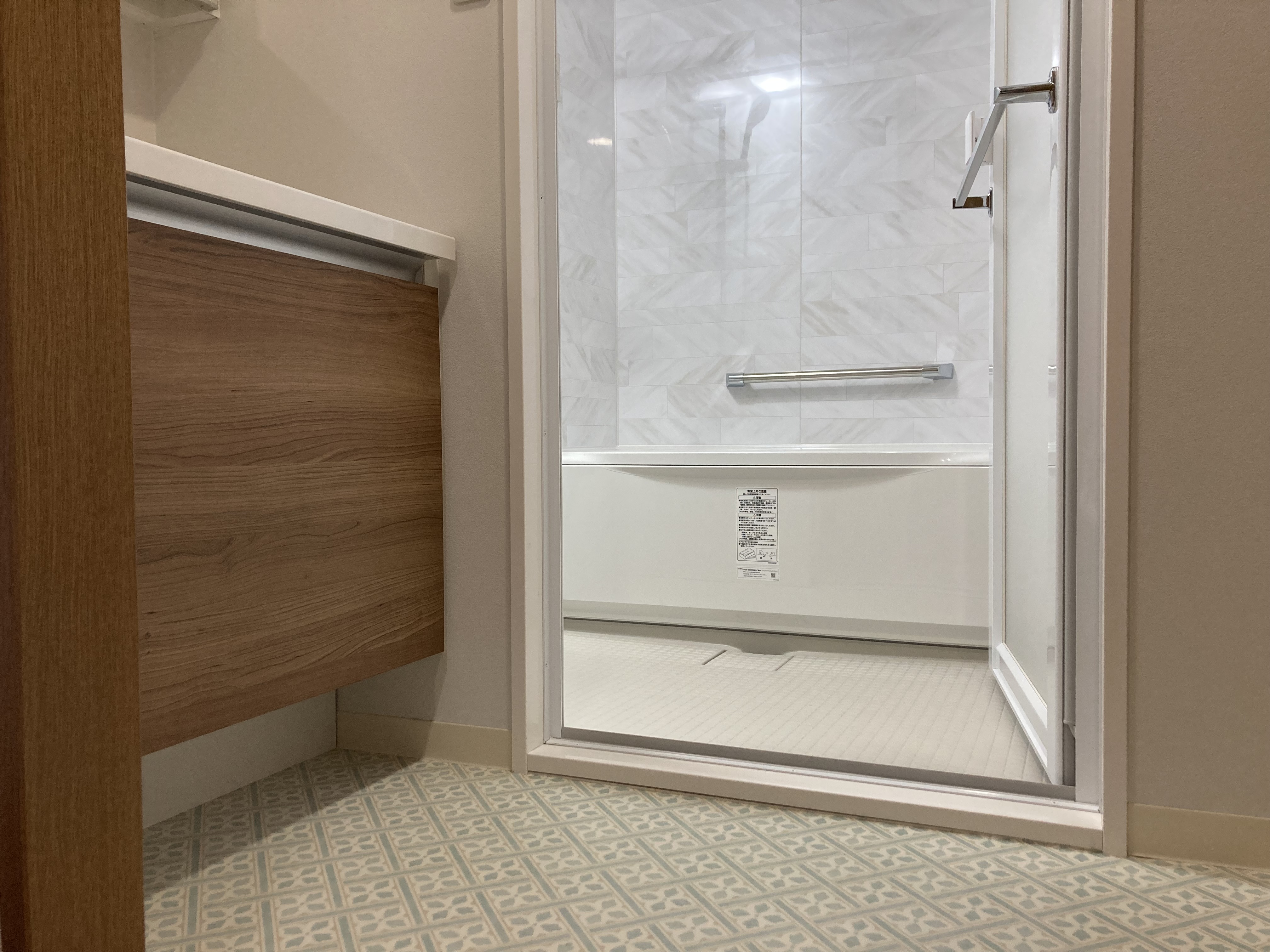 奥様にお選びいただいたモロッコタイル風のクッションフロアと