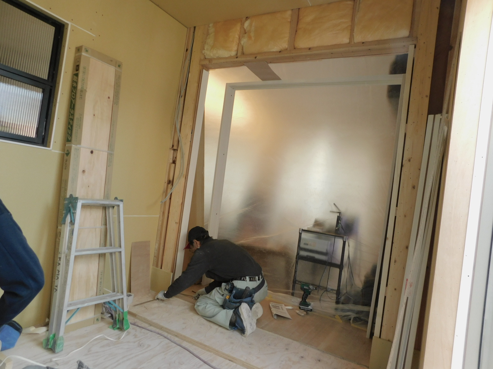 増築部の大工さん工事が進んだところで、既存部分との開通工事を行いました![]()