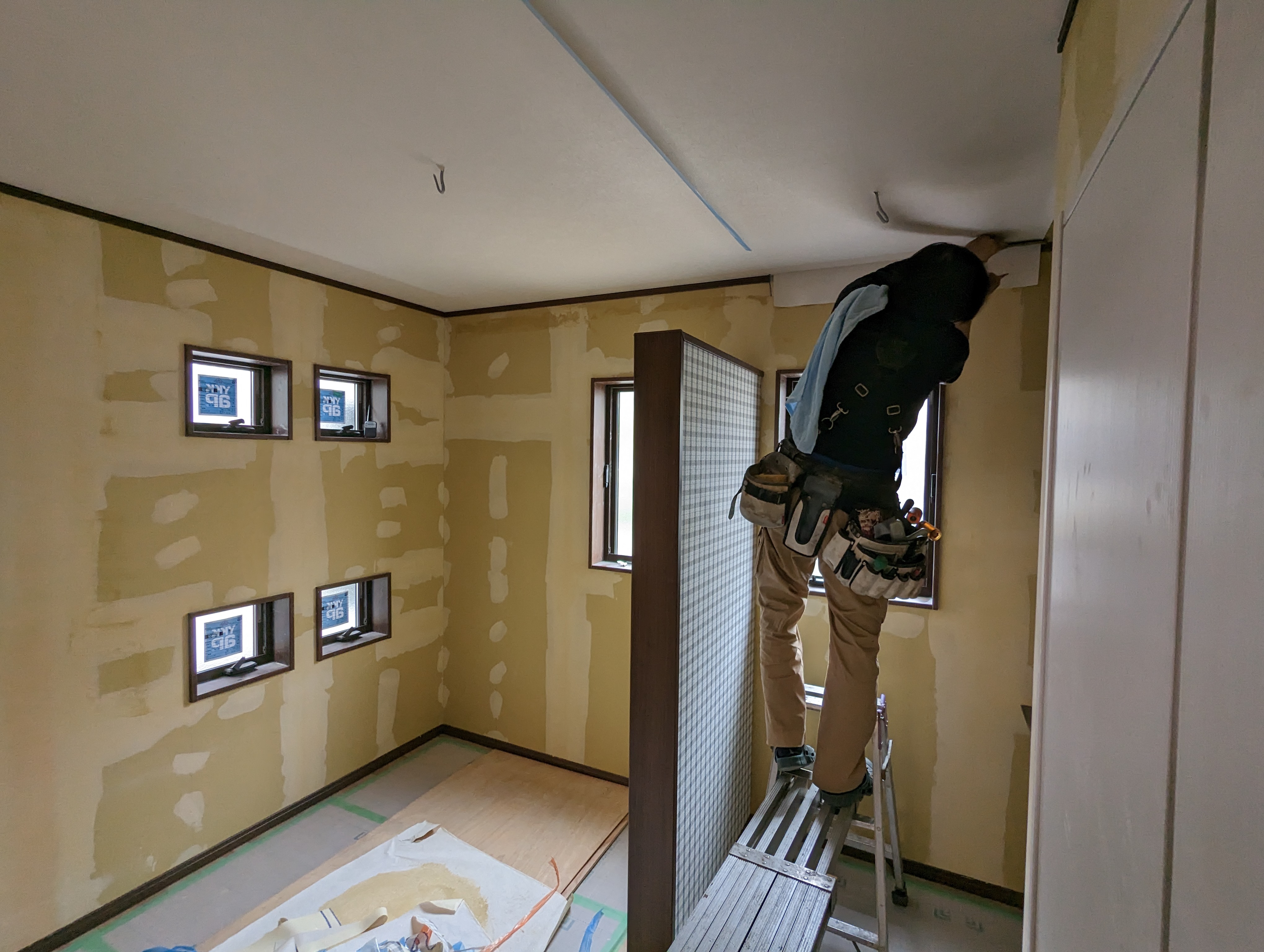 ボードの継ぎ目にパテ処理をし、その後丁寧に壁紙を貼っております![]()