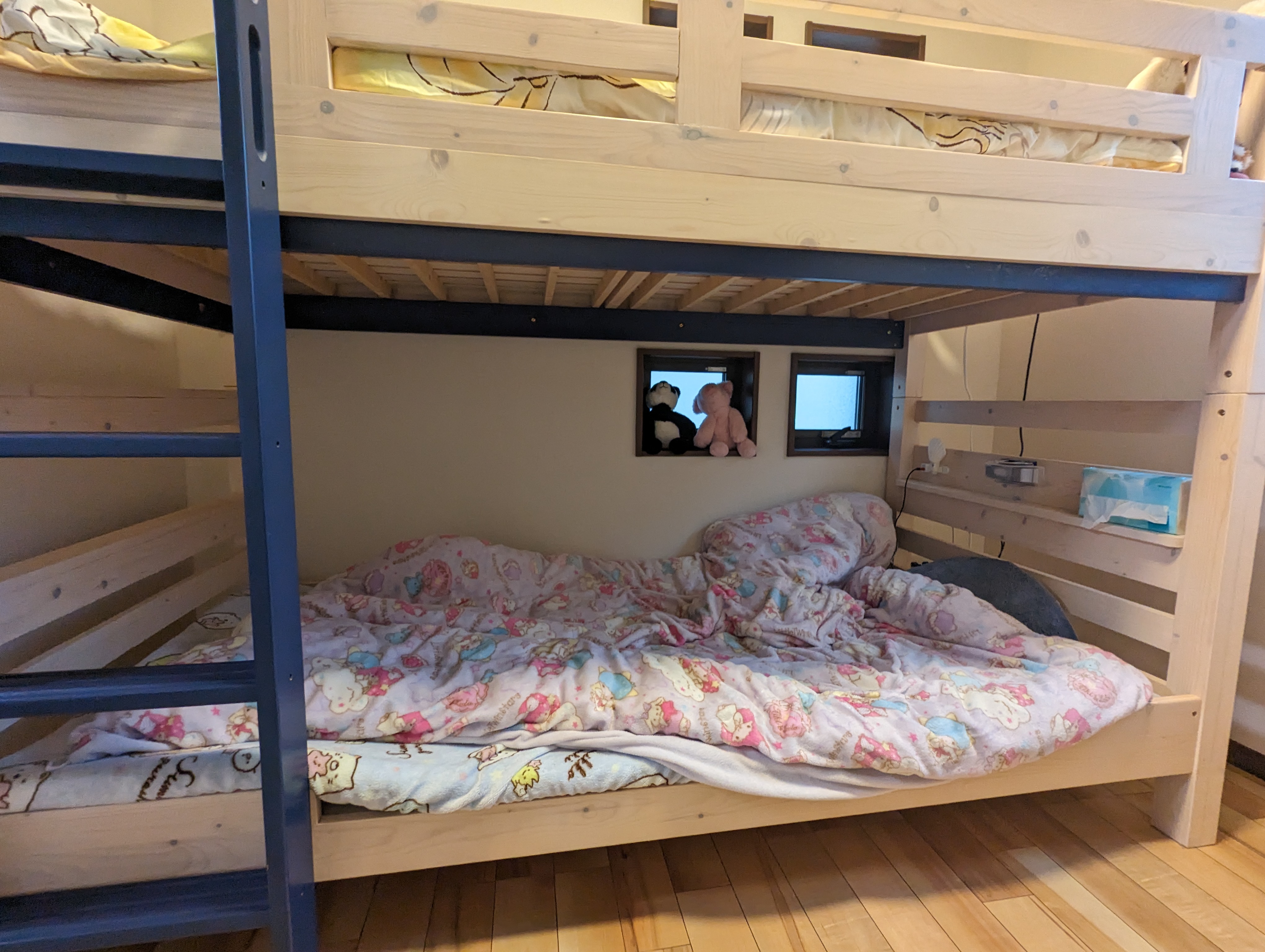 小窓も下の段で寝る人に使ってもらえる高さに合わせたのですごくいい感じです![]()