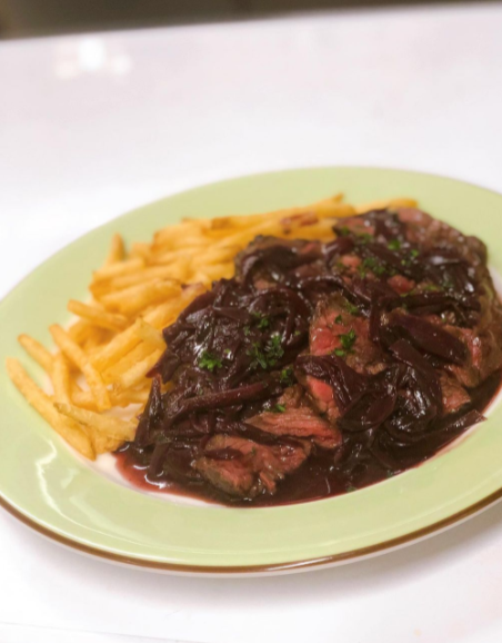 エシャロット(小さな玉ねぎ)と赤ワインのソースは香りもよくコクがあり、