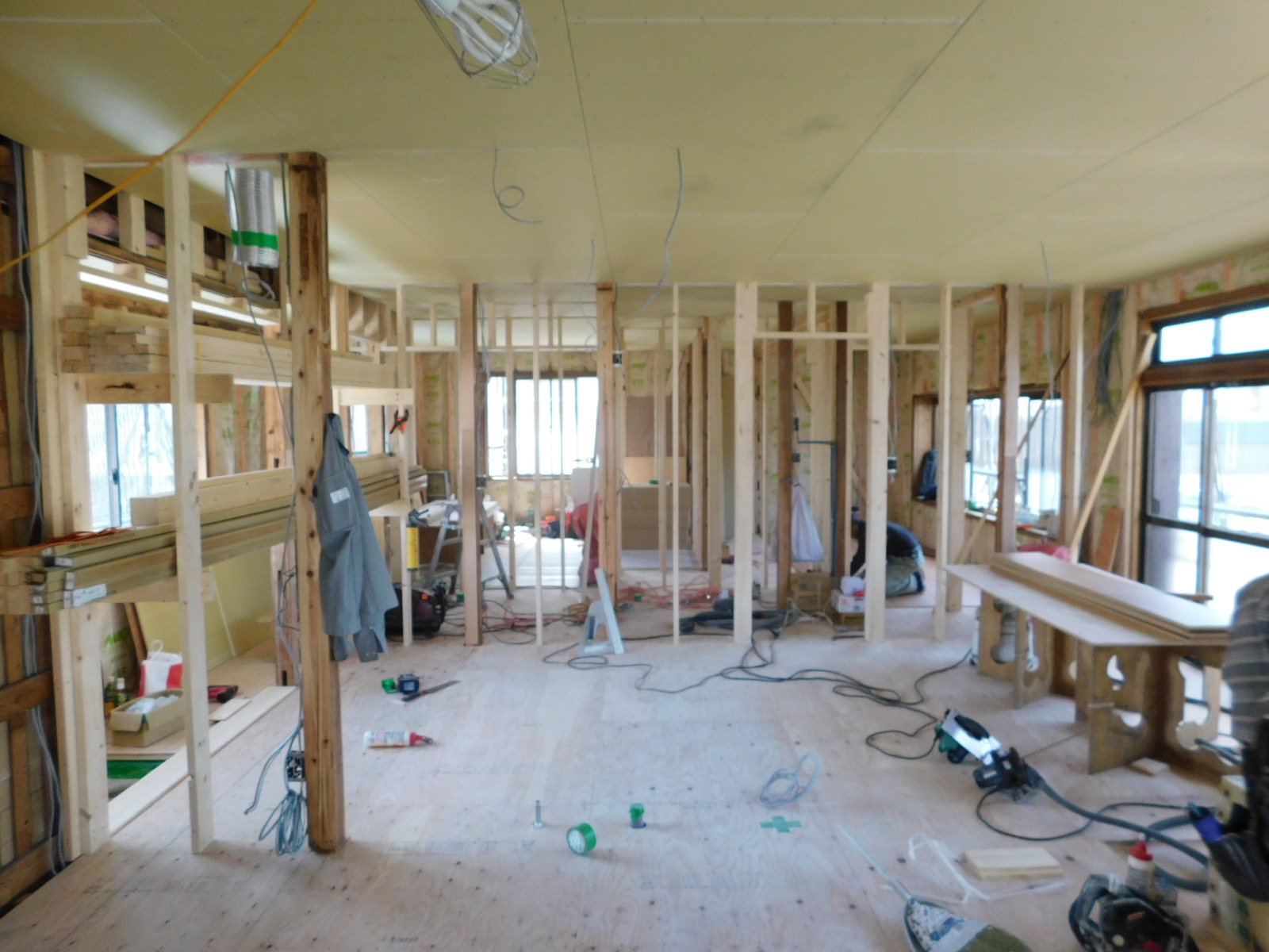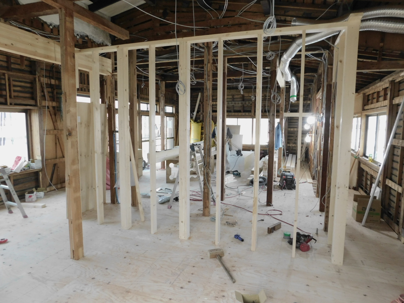 全面的に間取りが変わるので、新しい柱や梁を入れました。