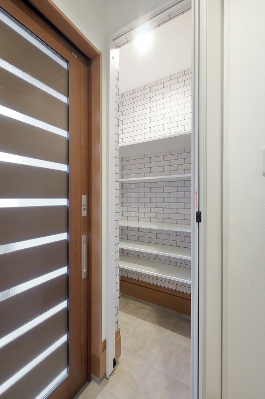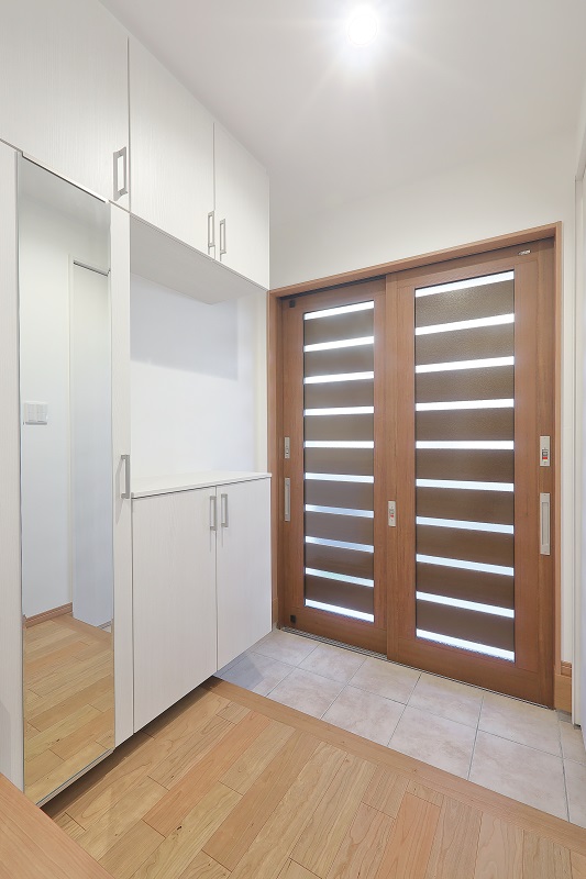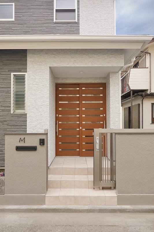 玄関外はスライド式の門扉やオリジナル色で塗装した門塀