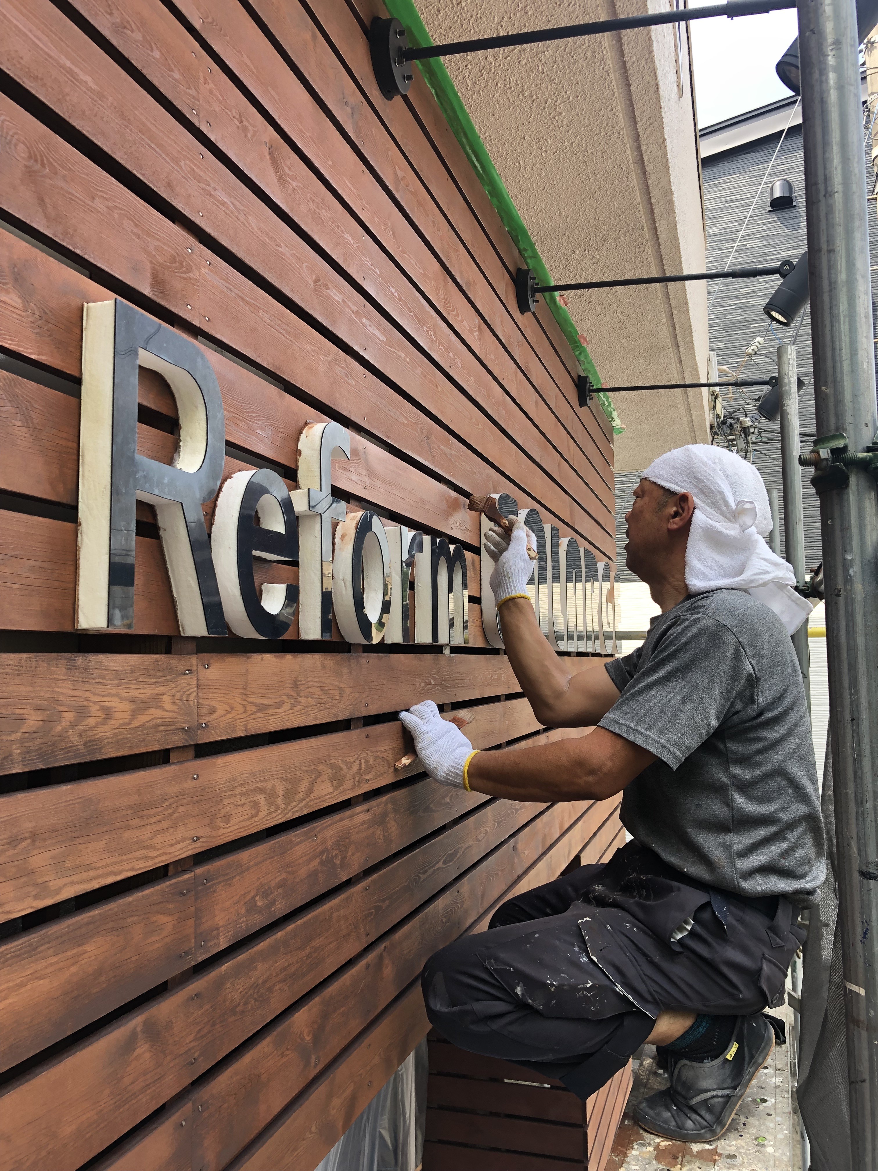店舗正面の羽目板は塗装工事が終わり、先日足場が外れました。