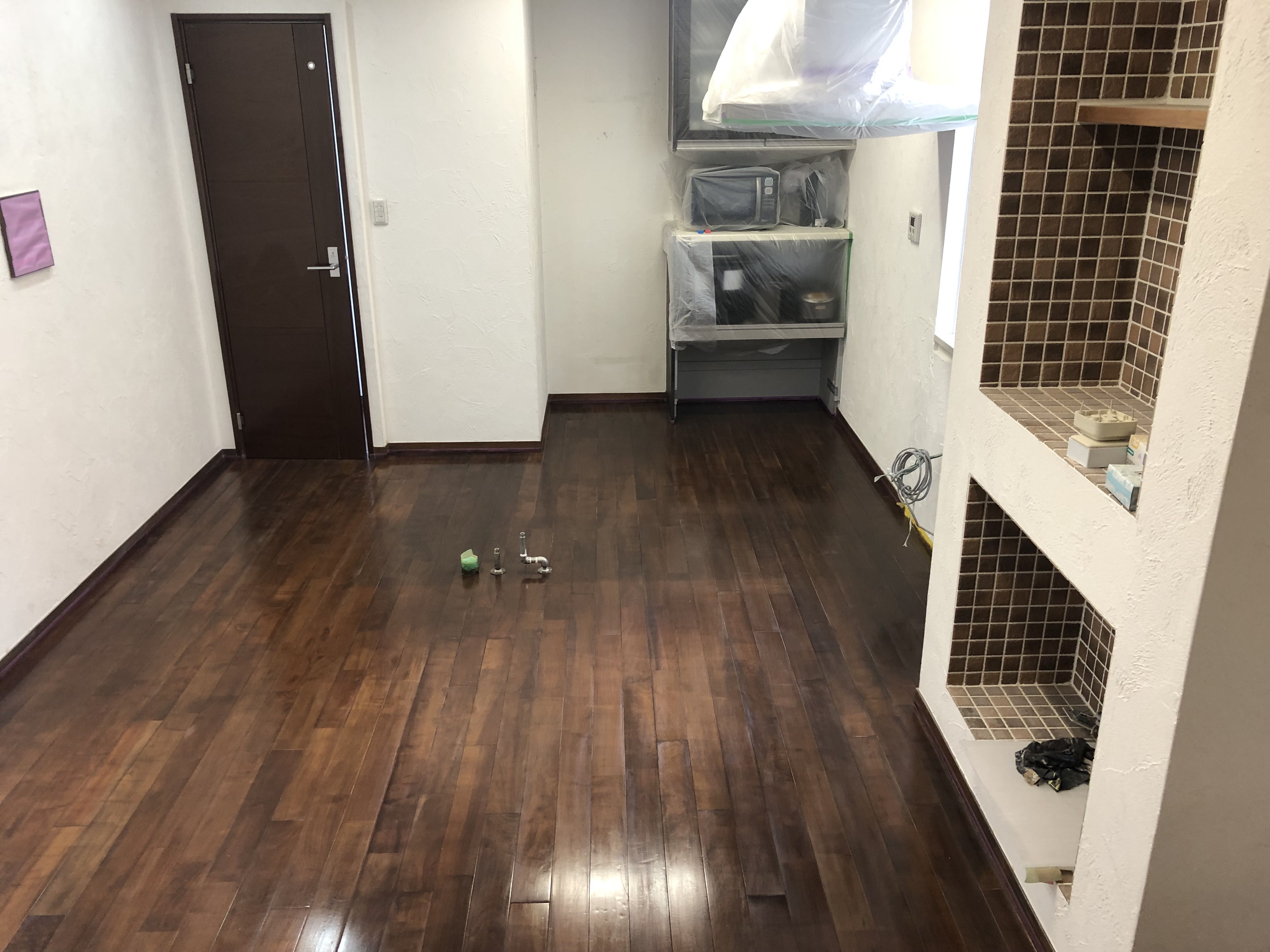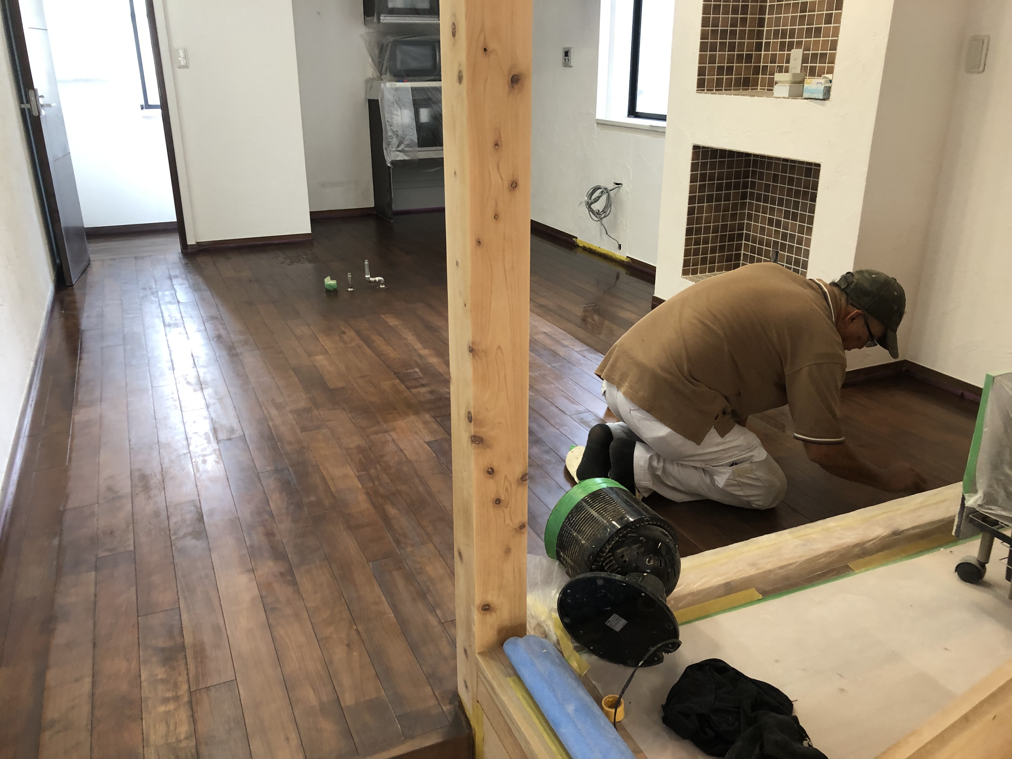 内装の床材は無垢のウォールナットなので、表面を削って再塗装しました。