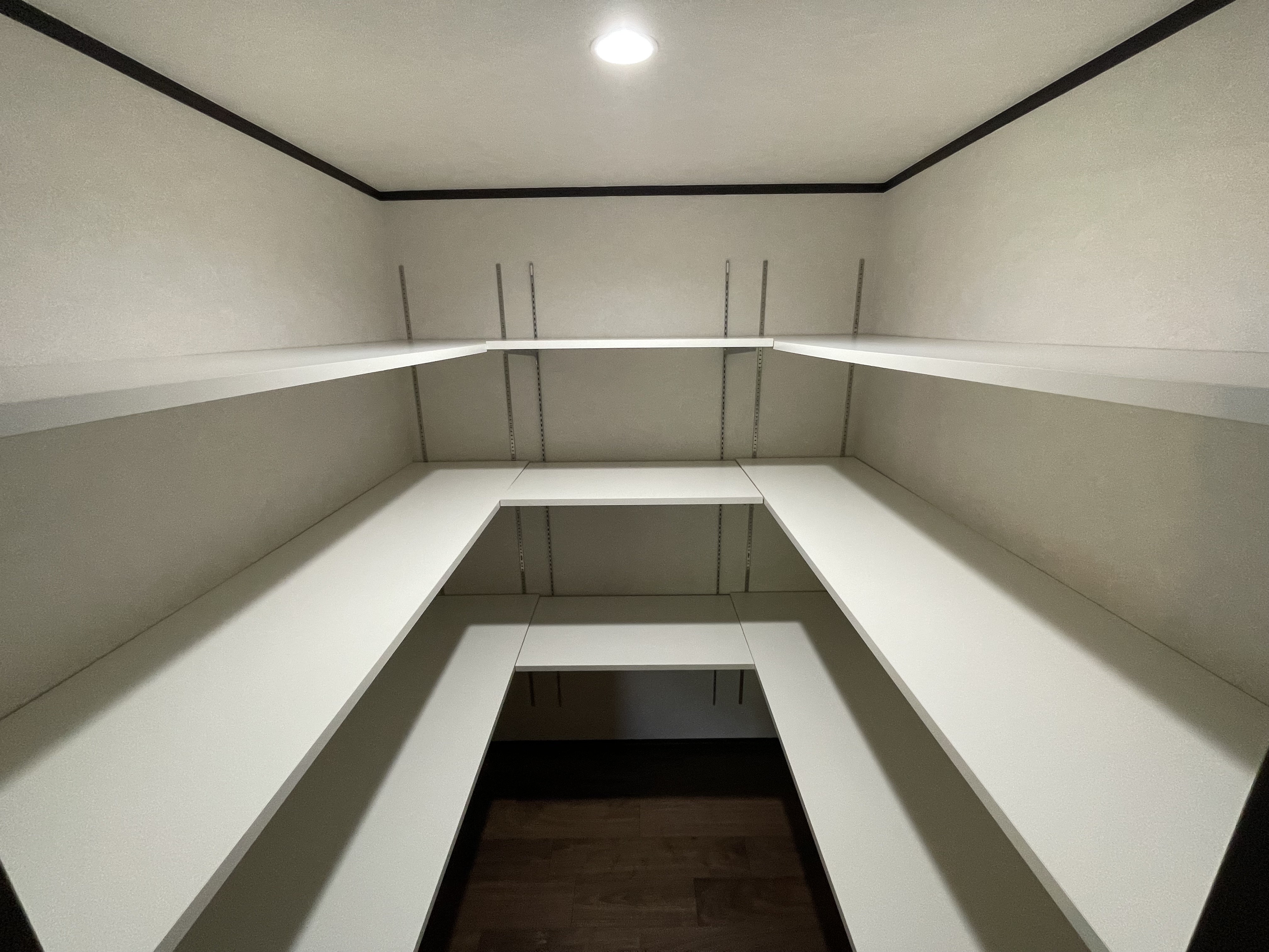 キッチンに隣接するパントリーは、コの字型の可動棚を設置して大容量の収納になりました![]()