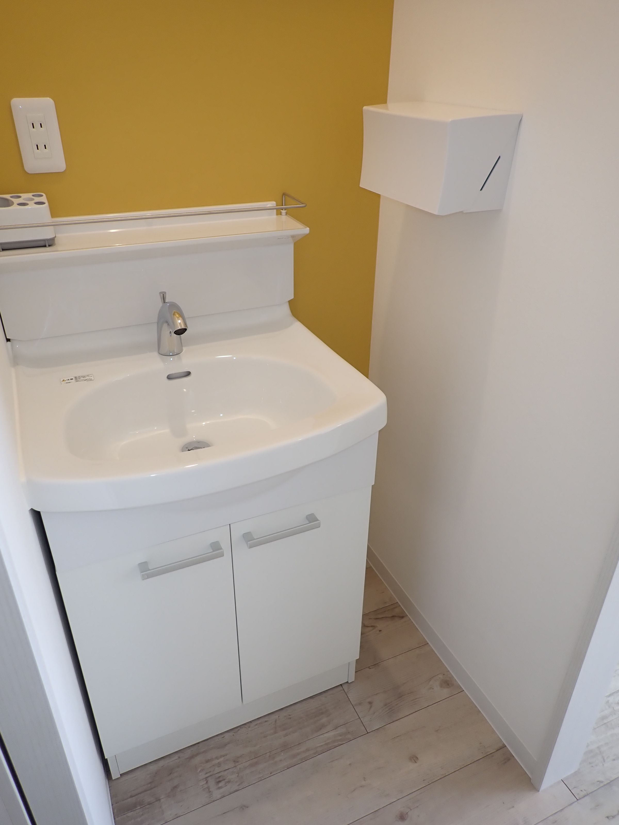 うがいで使うコップ等がおける棚付き洗面台。自動水栓です
