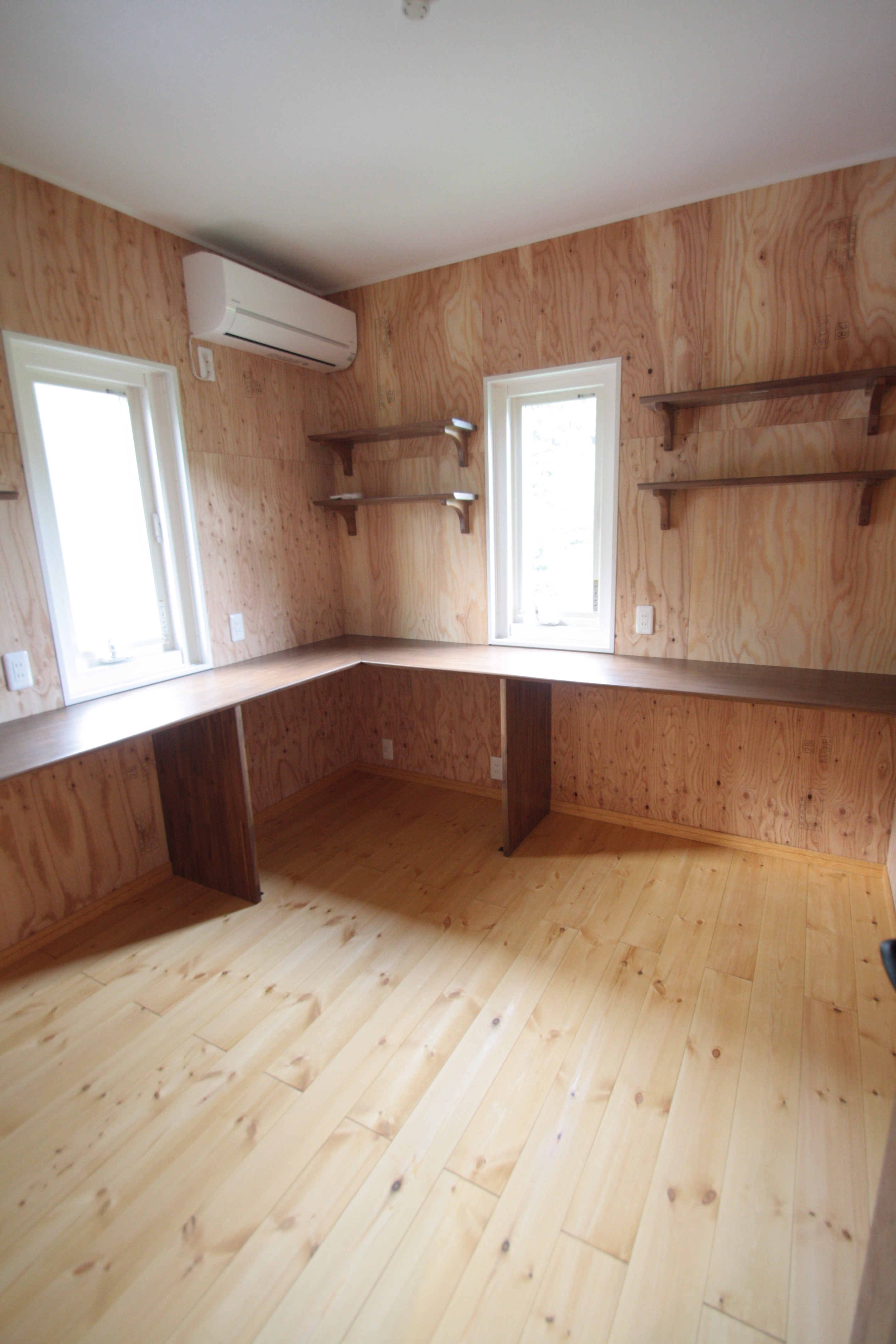 熟練のN大工さんが丁寧に、無垢のパイン材を貼っているところです![]()