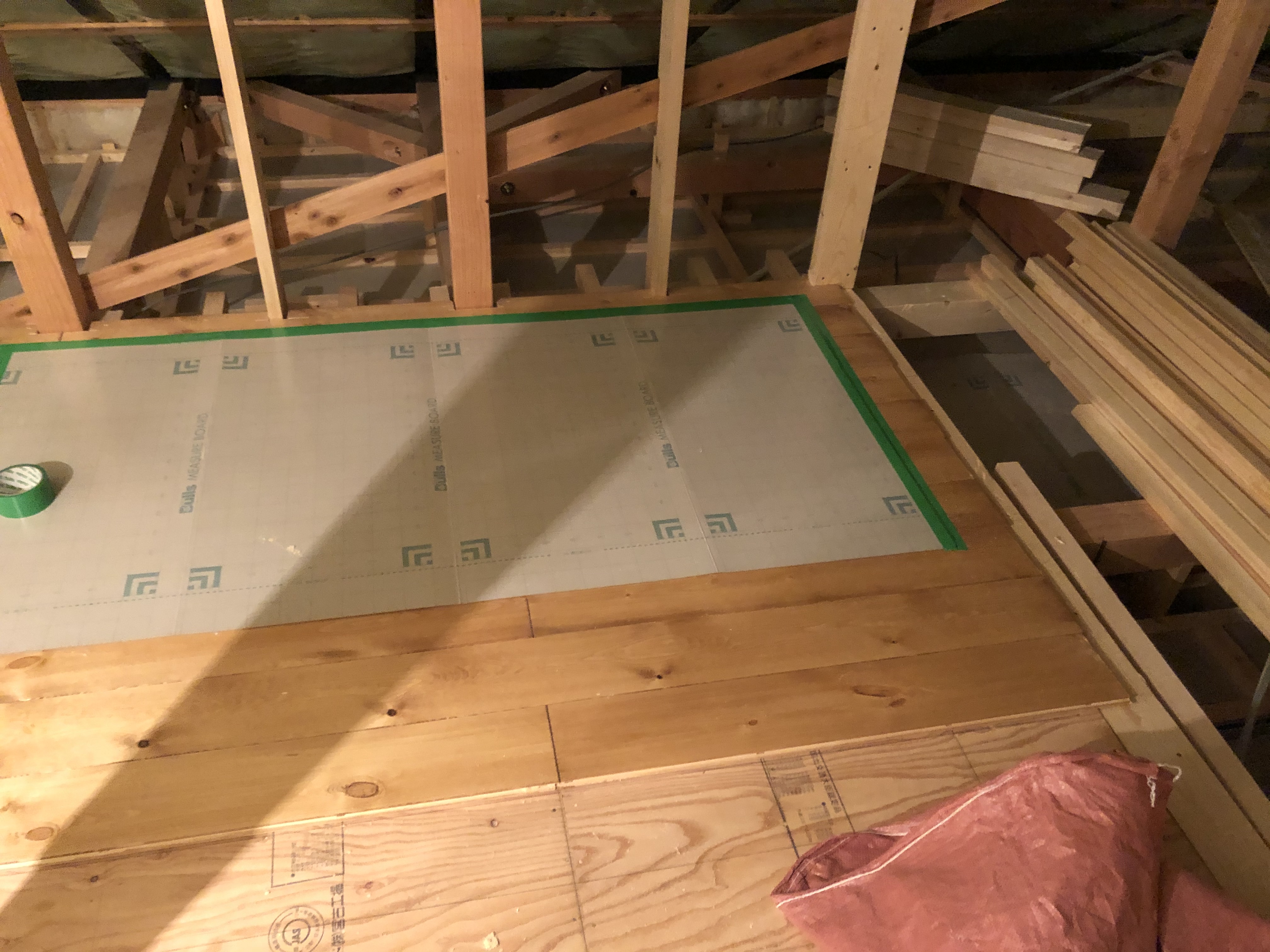 1坪ほど貼るとすぐに養生シートを上から貼って、傷や汚れから床材を守っています。