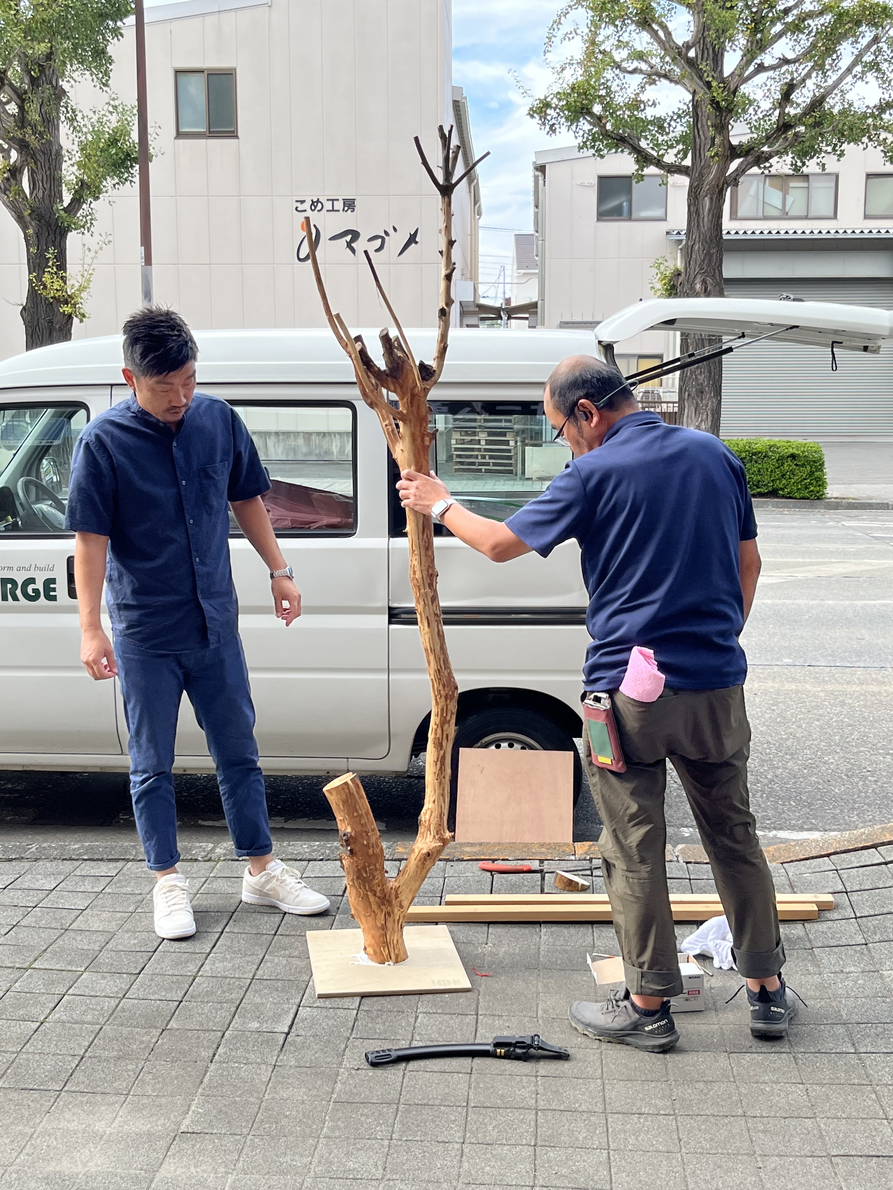 なんと鈴木主任宅のお庭からいただいた木を固定して、