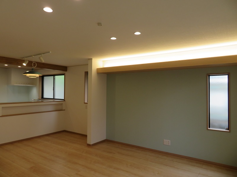 1階LDKは、ブルーグリーンのアクセントクロスとキッチンが映えるナチュラルな空間に大変身![]()