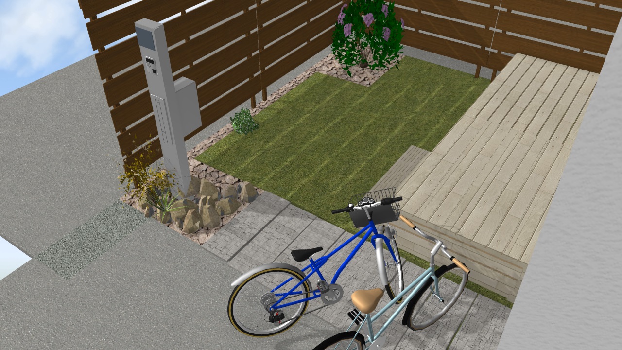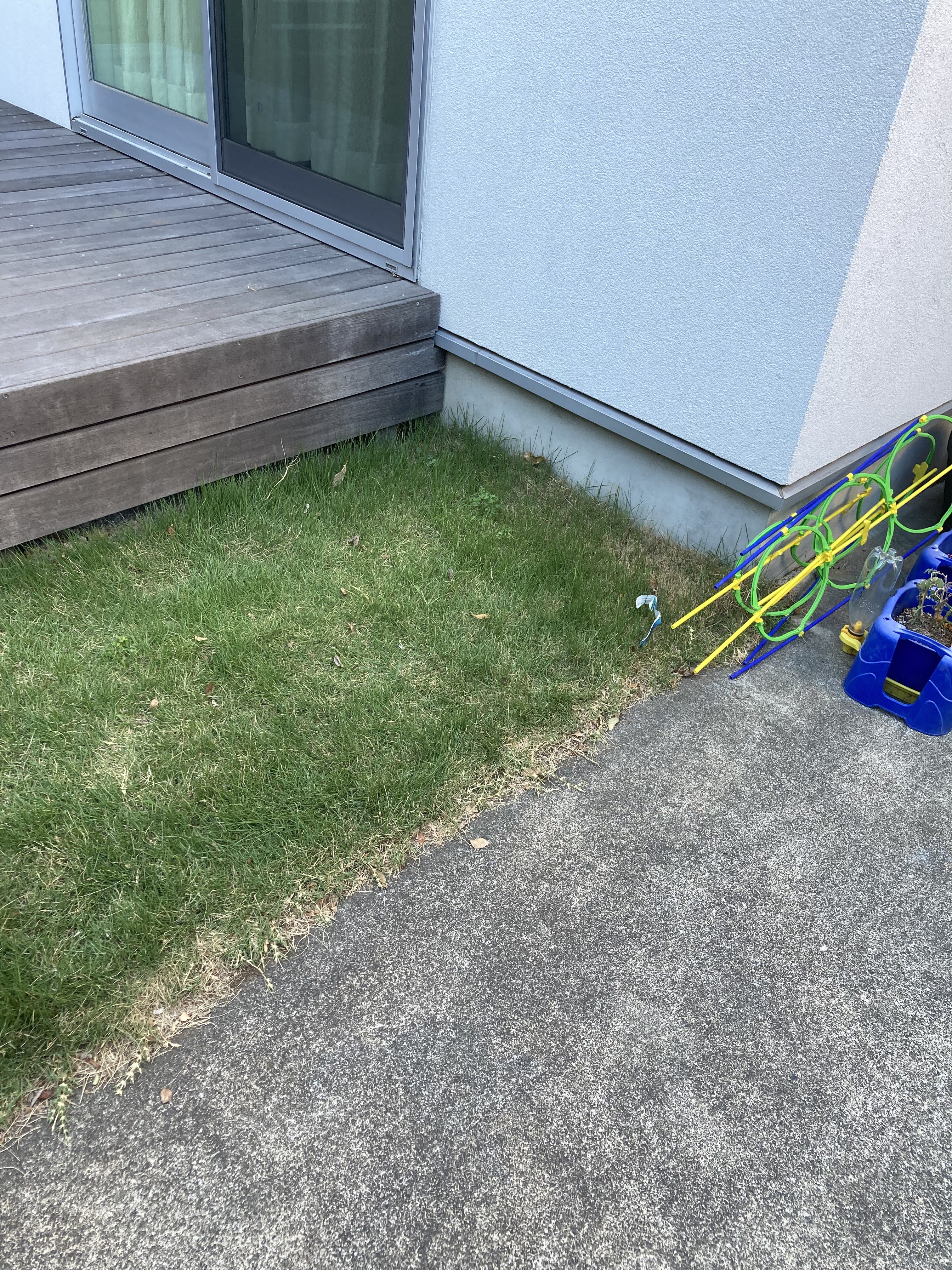機能門柱は使い勝手に支障のない位置に移設、デッキ横の芝生を一部撤去し