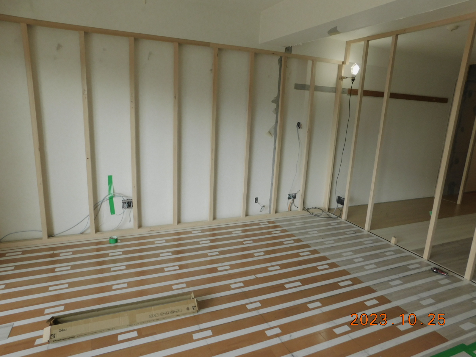 間取りを変更し、床にはマンション用の上貼りフロアを貼って行きます。