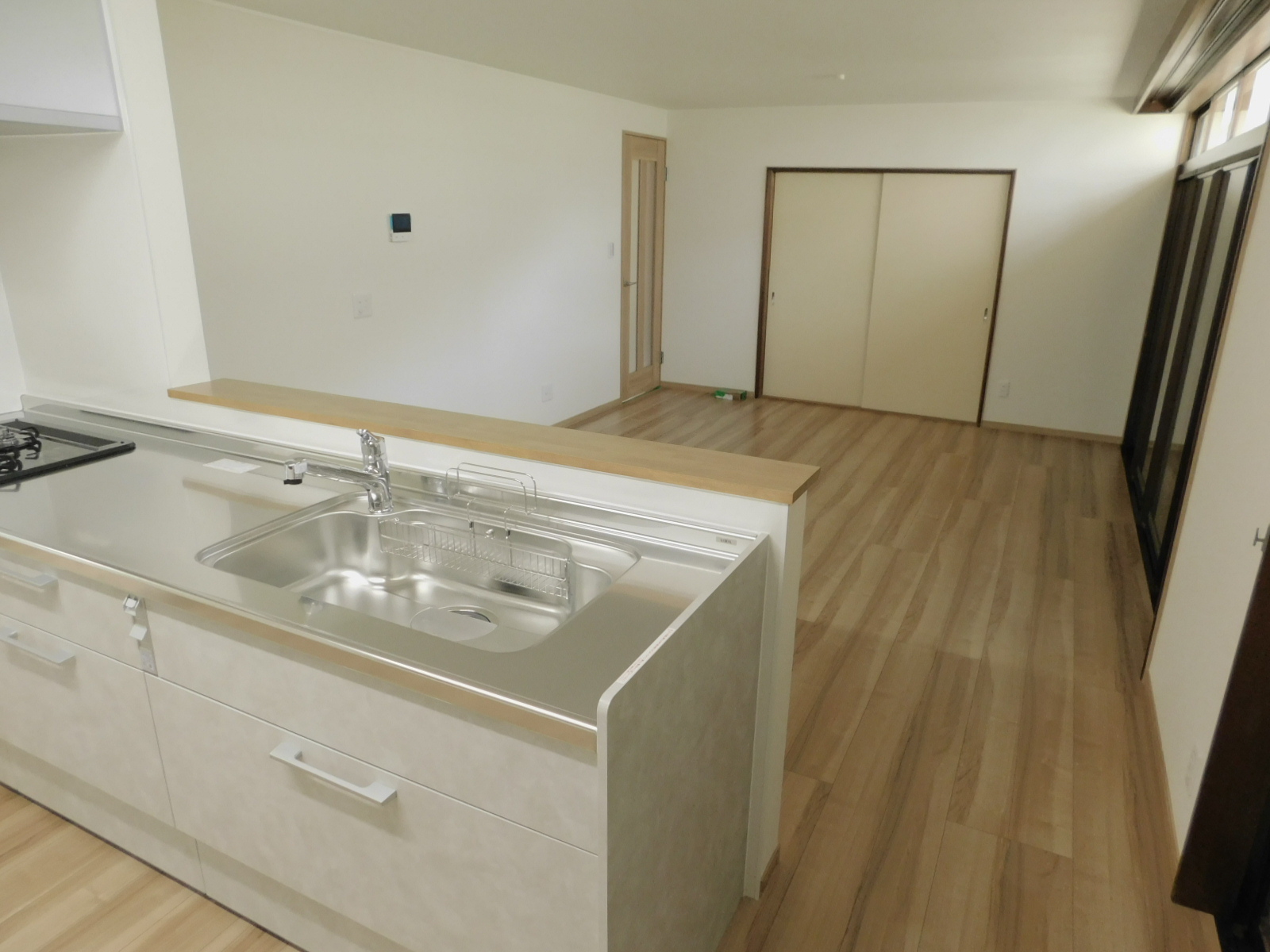 キッチンは対面化と共に、リビング+ダイニングキッチンをひとつの空間にまとめ