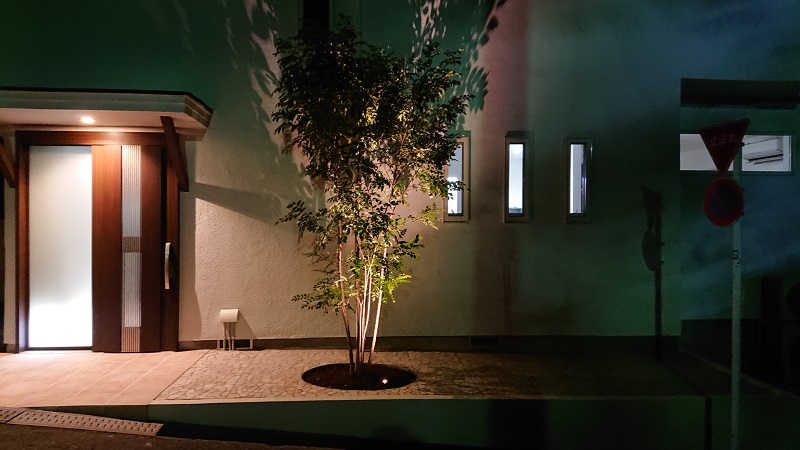 夜のアプローチも美しい、光の陰影にこだわった玄関ファサード